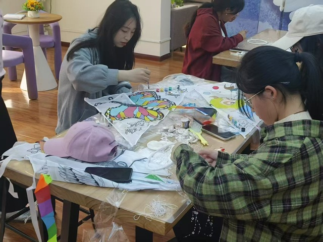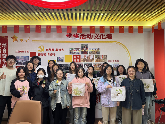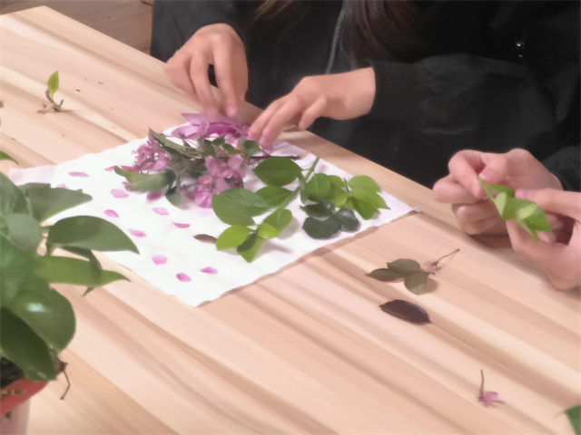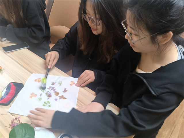 4月18日,商务英语2301班于太行书院太行社区功能性党支部举办了以“邂逅拓染 解锁非遗之美”为主题的完满团支部活动。活动伊始,由组织者简要介绍植物敲拓染的历史背景、染色原理及环保意义。接下来同学们现场学习染色的步骤,包括植物的选择、敲拓的方法、染色的技巧等。参与者分组进行操作,首先选择自己喜爱的植物,然后用木槌敲打,使植物的汁液渗透到白布上,形成自然的图案。完成染色后,将作品晾晒,等待染料成型。希望通过活动,能够激发同学们对环保的关注和参与,共同为保护环境做出贡献。