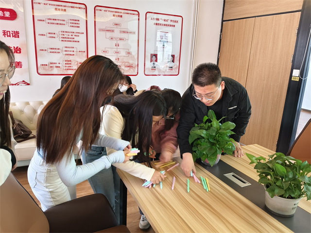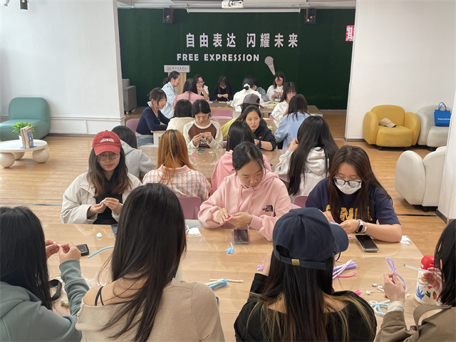 4月16日,商务英语2202班于杏花书院表达力大厅开展了以“‘风’起四月,铃响校园梦”为主题的完满团支部活动。活动现场,同学们各展所能。制作花束风铃的同学精心缠绕扭扭棒,塑造出娇艳欲滴的花朵,色彩搭配和谐,层次丰富,仿佛将春天的烂漫浓缩其中;打造蝴蝶铃兰风铃的同学,则凭借丰富想象力,让扭扭棒化作灵动蝴蝶与清新铃兰,动静结合间充满生机;制作手工小狗风铃的同学专注刻画小狗的憨态,圆圆的身体、灵动的耳朵,萌趣形象跃然眼前。同学们积极互动,遇到难的步骤时共同探讨,分享创意技巧。