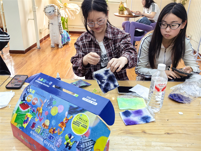 5月12日,英语2405班在三达书院意空间开展以非遗扎染技艺体验为主题的完满团支部活动,同学们深入了解扎染从唐代“青碧缬衣裙”到白族现代传承的起源与发展,感受古人智慧。在实践环节,大家以白绢为画布,巧用橡皮筋、木夹等工具创作,有的扎出对称星辰,有的模仿“鹿胎缬”留白,浸染后的布料青蓝雪白交织,件件作品独具特色。同学们还相互品评,尝试多层扎染打造水墨渐变,融入英文缩写图案。此次完满团支部活动将非遗传承与美育结合,既锻炼动手能力,也让传统文化在青年中焕发新生。