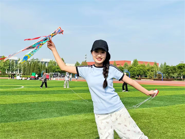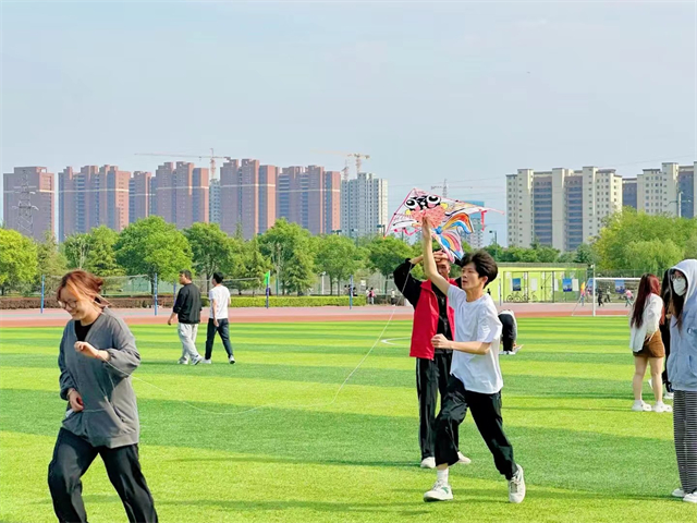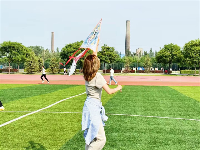 在骄阳下的操场里,同学们怀着赤诚的希冀与期待,将他们对生活的高歌,放飞于长空之中。在槐夏,他们握着梦想的线轴,奔跑在广阔的绿茵上,见证着“梦想与实践”翱翔天际,与晴空共“绘”一幅生动的青春卷画,纸鸢在天际摇曳,迎风而上。纸鸢——恰如青春之蓬勃,终将高扬于天际。