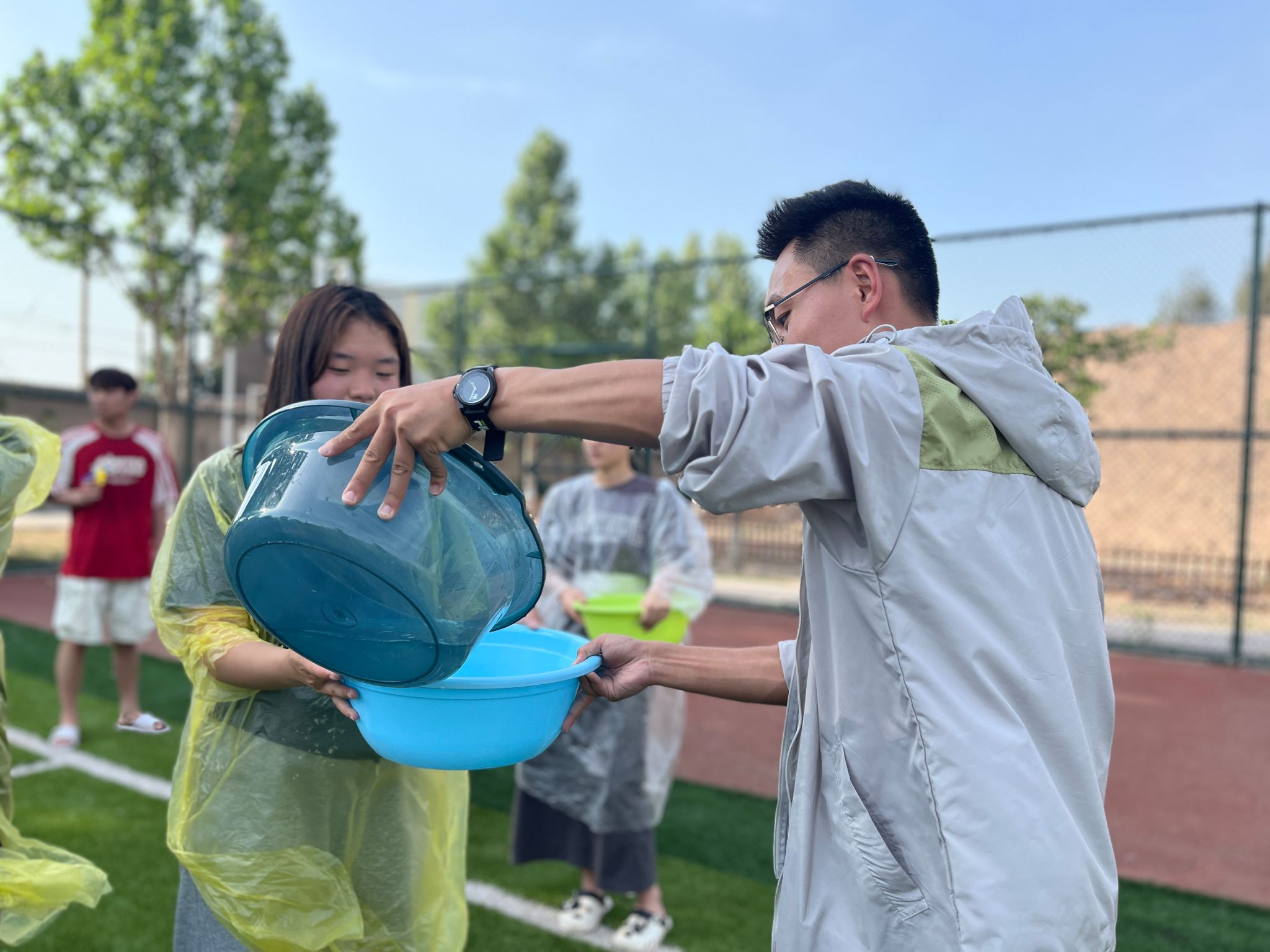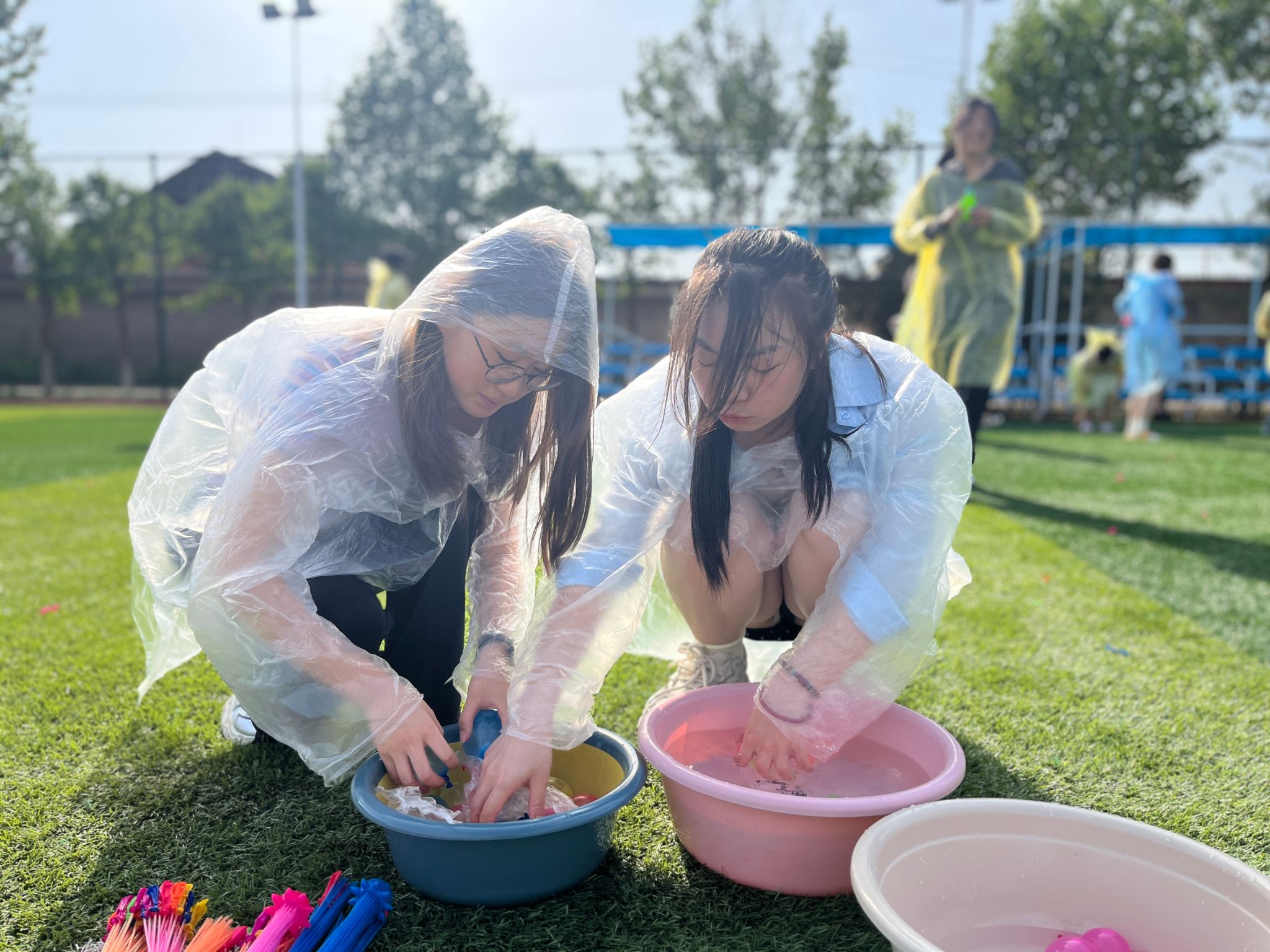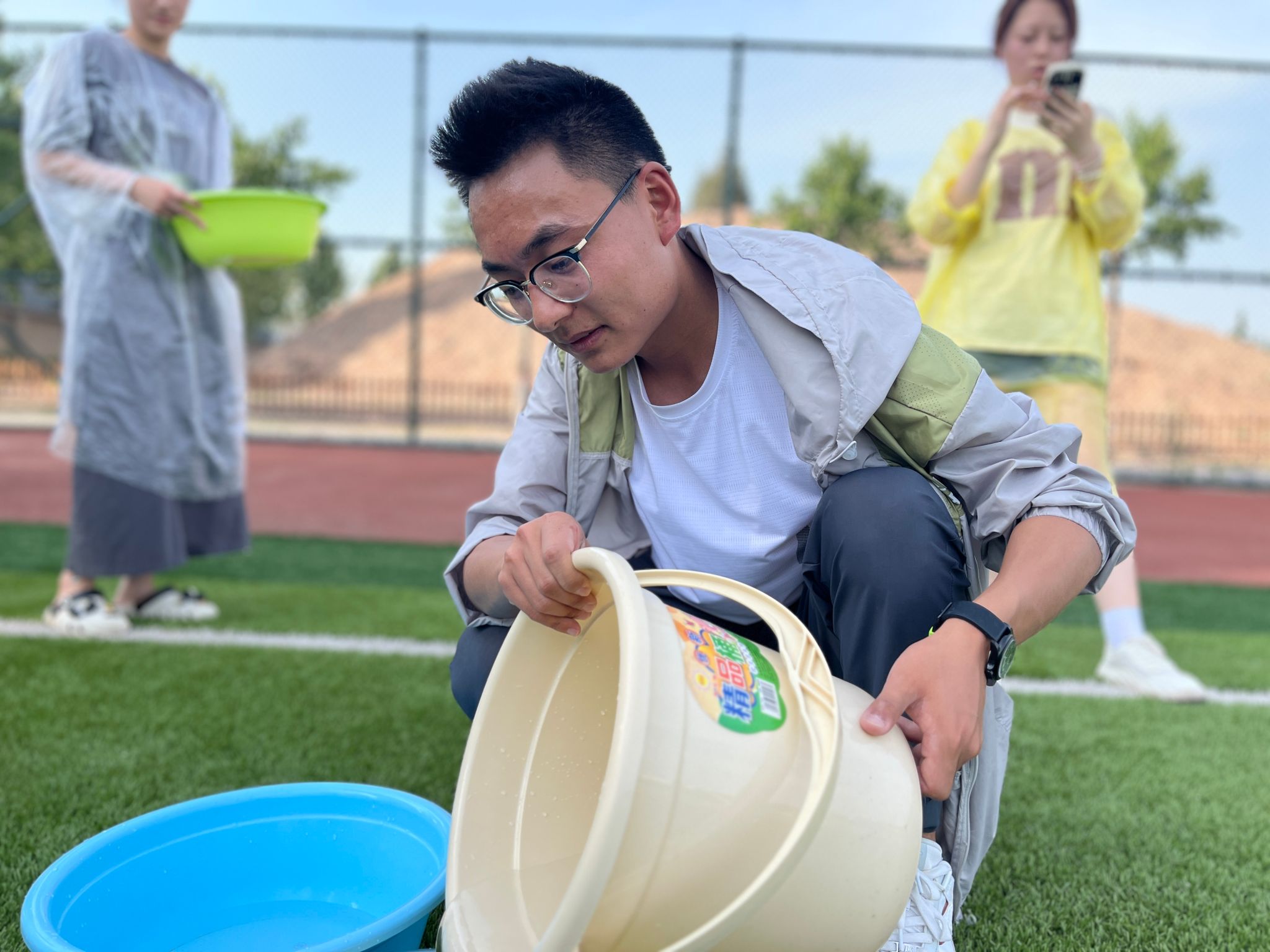 一个个水球已然鼓鼓囊囊,同学们也都急不可耐,大家积极组队,商量战术,活动分为两个环节,第一个环节为水球大战,所有队员进入场地中央,手持水球进行混战;第二个环节为水盆接力,每组成员排成一排前后站好,成员需要接力从头顶举过水桶向后盲倒,依次传递、一齐运送“宝贵水源”,最终根据桶里剩余水量确定哪组获胜。