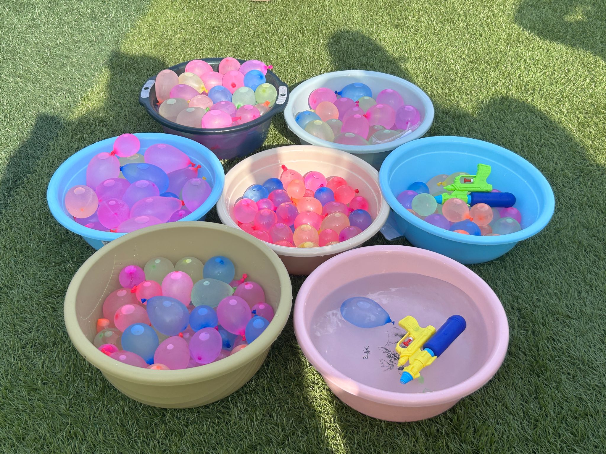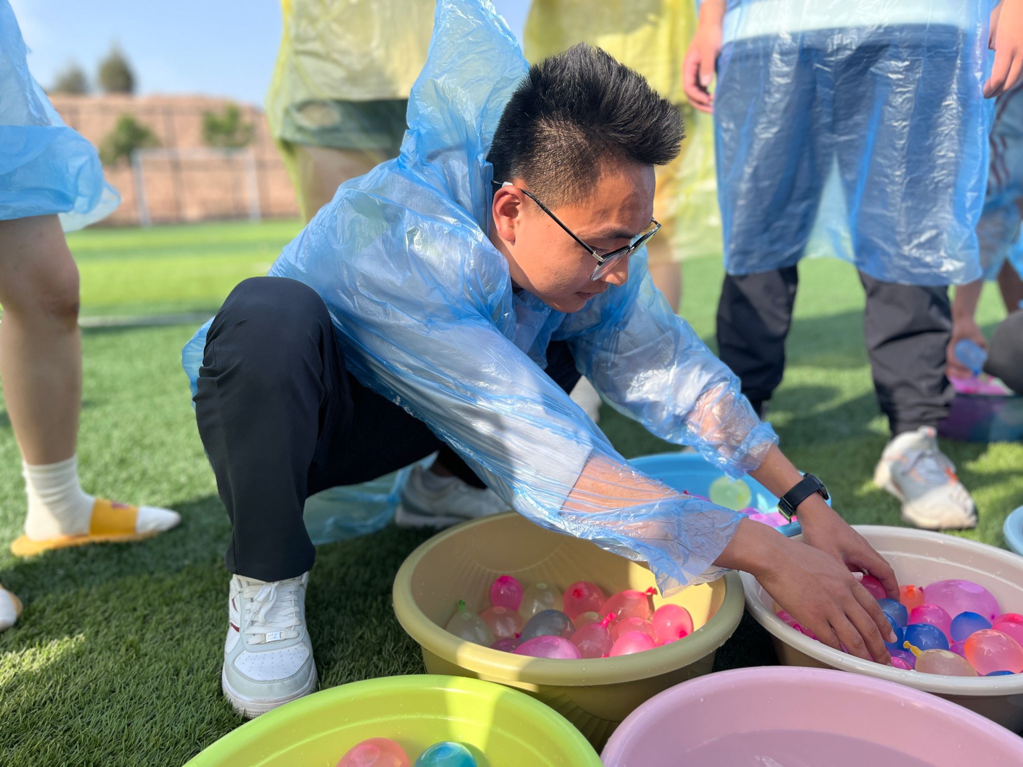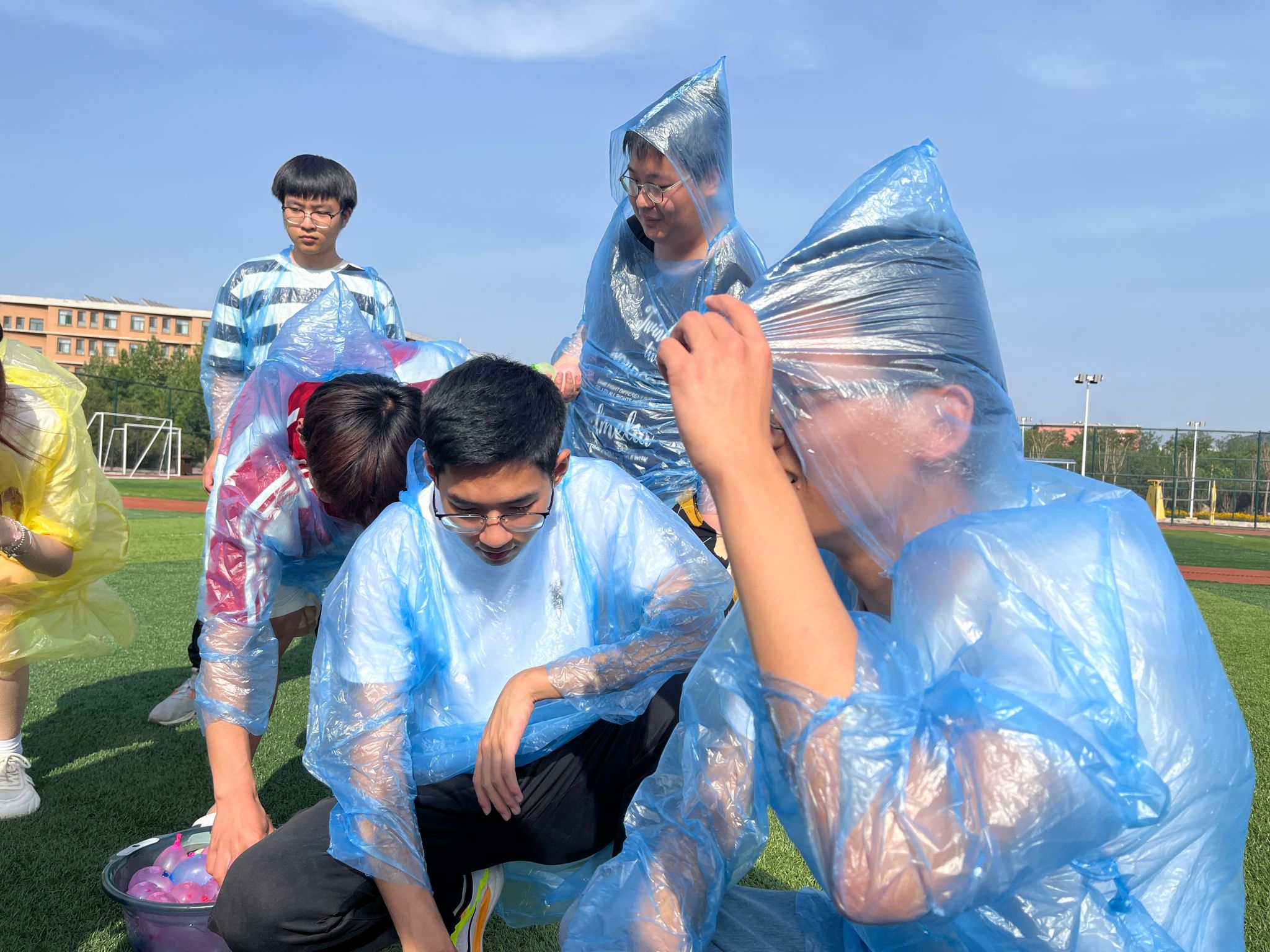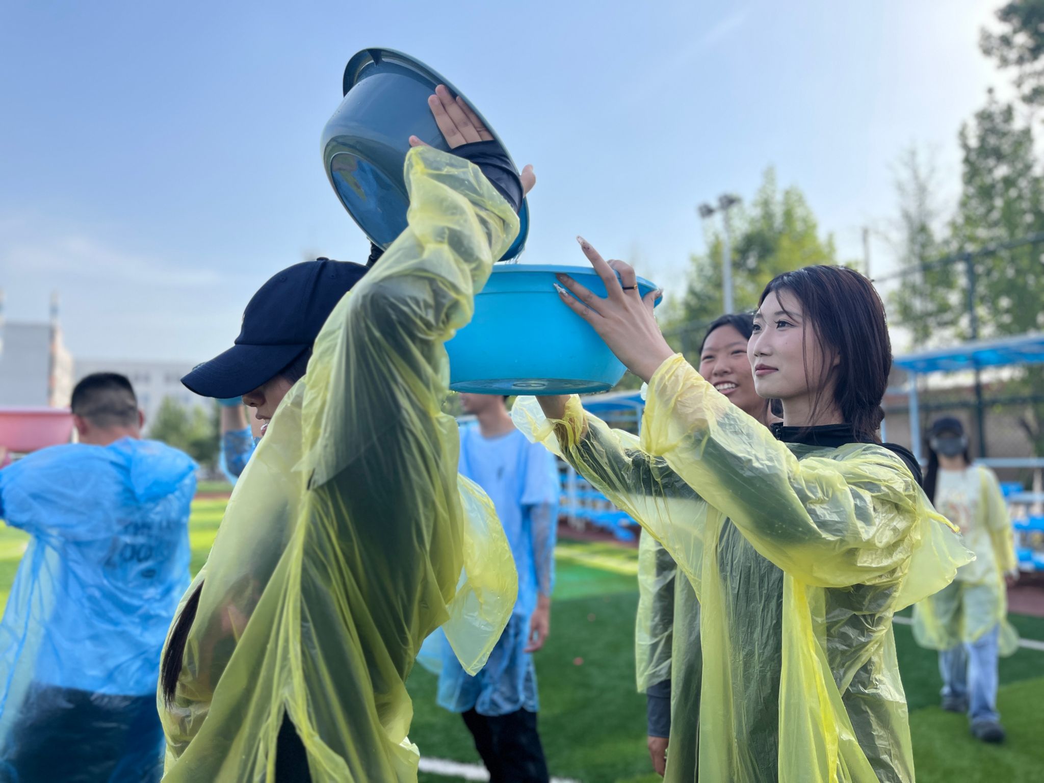 一个个水球已然鼓鼓囊囊,同学们也都急不可耐,大家积极组队,商量战术,活动分为两个环节,第一个环节为水球大战,所有队员进入场地中央,手持水球进行混战;第二个环节为水盆接力,每组成员排成一排前后站好,成员需要接力从头顶举过水桶向后盲倒,依次传递、一齐运送“宝贵水源”,最终根据桶里剩余水量确定哪组获胜。