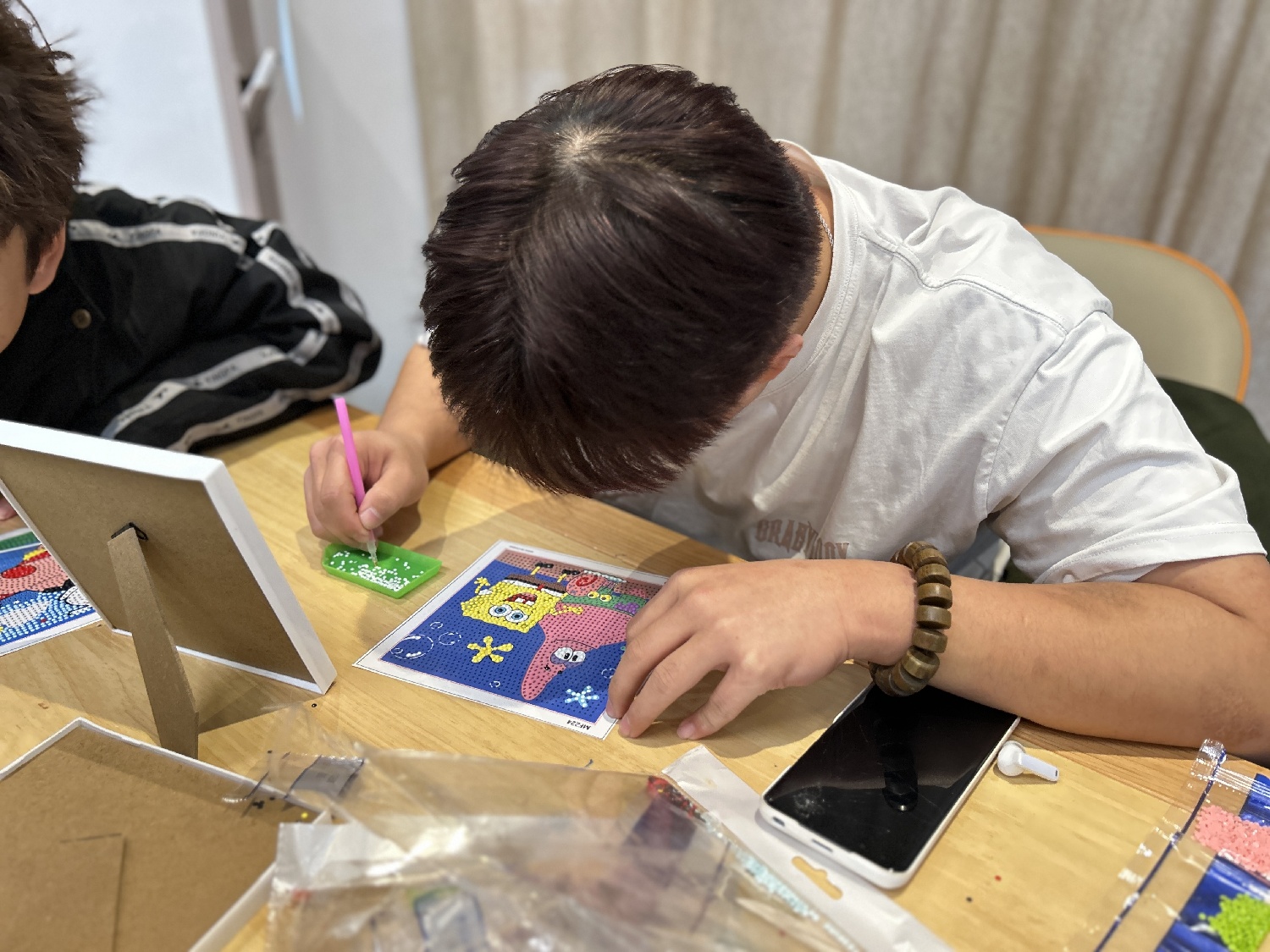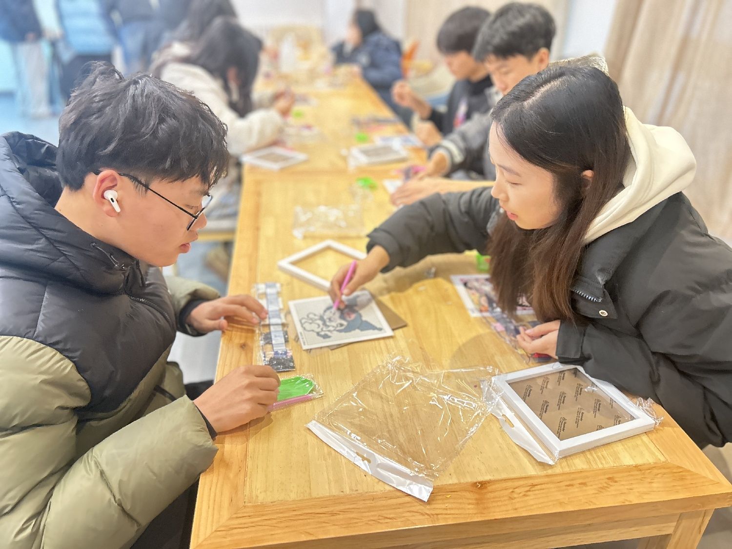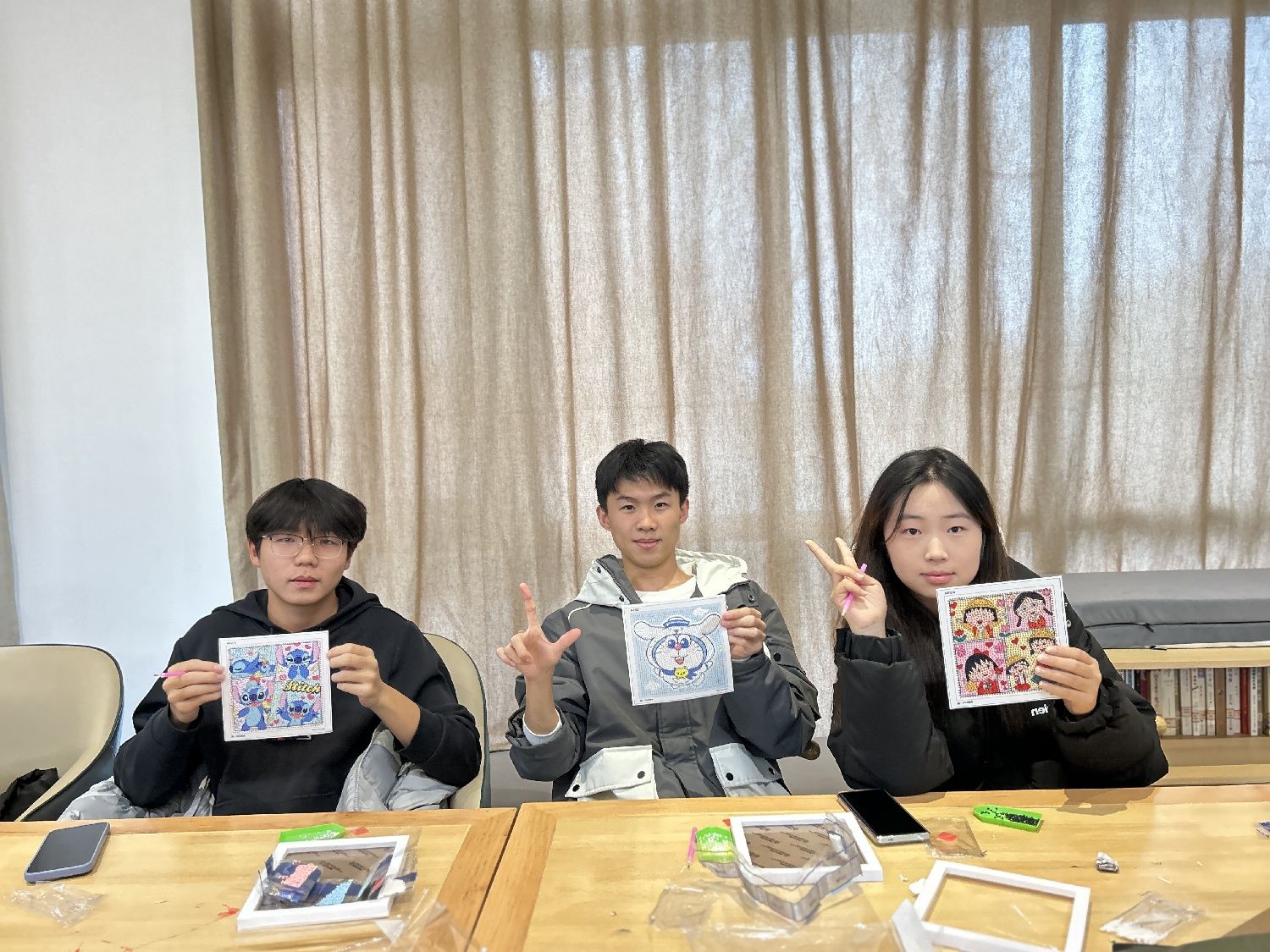 在创作过程中,同学们自由表达,积极交流创作心得。他们分享自己的创作灵感和想法,共同探讨钻石画的制作技巧和艺术魅力。整个活动现场洋溢着轻松愉快的气氛,每一位同学都沉浸在这份艺术的美好之中。