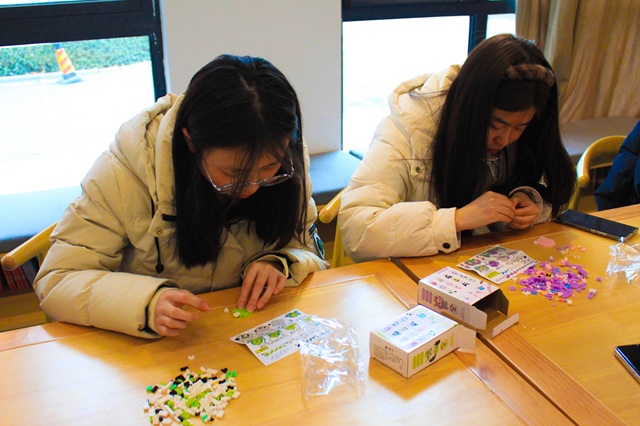 活动中,有人精心搭建着玉桂狗造型的积木,专注的神情透露出内心的宁静,或许是希望像玉桂狗一样治愈、温暖;有人则将多个动物形象组合,构建出充满趣味的动物乐园场景,展现出积极乐观的心态。随着一块块微小的积木拼接成型,现场的氛围愈发轻松愉快。同学们完成作品后,开始互相分享自己的创意。大家围绕着这些可爱的动物积木,交流着自己在拼搭过程中的感受,现场充满欢声笑语。
