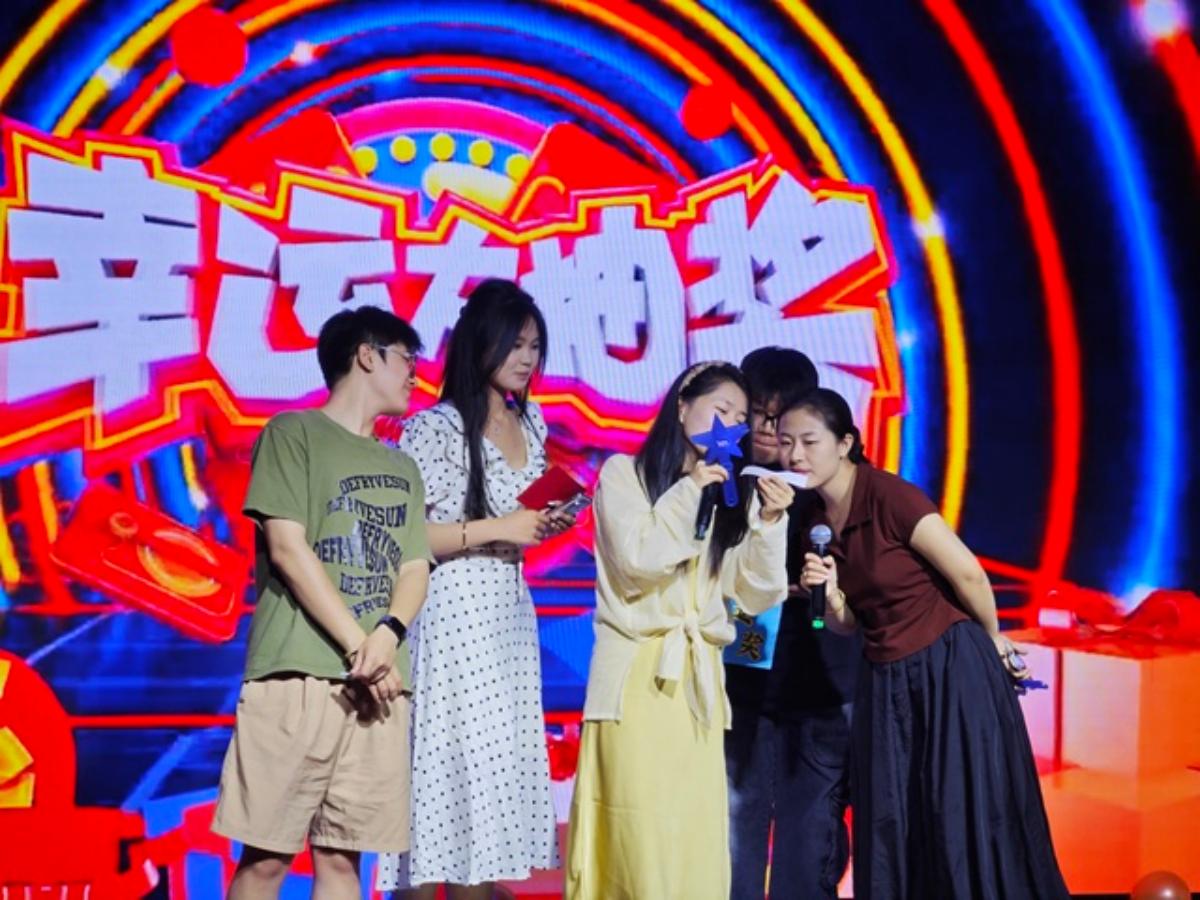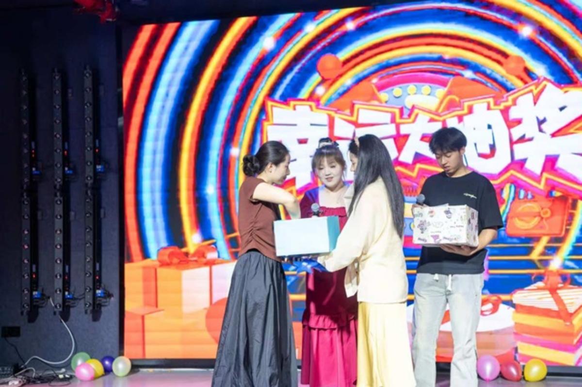 两轮抽奖环节穿插其中,成为晚会最“高光时刻”。主持人邀请两位辅导员老师抽取幸运观众,在念出学号姓名的瞬间,现场欢呼与期待交织,晚会氛围持续升温。