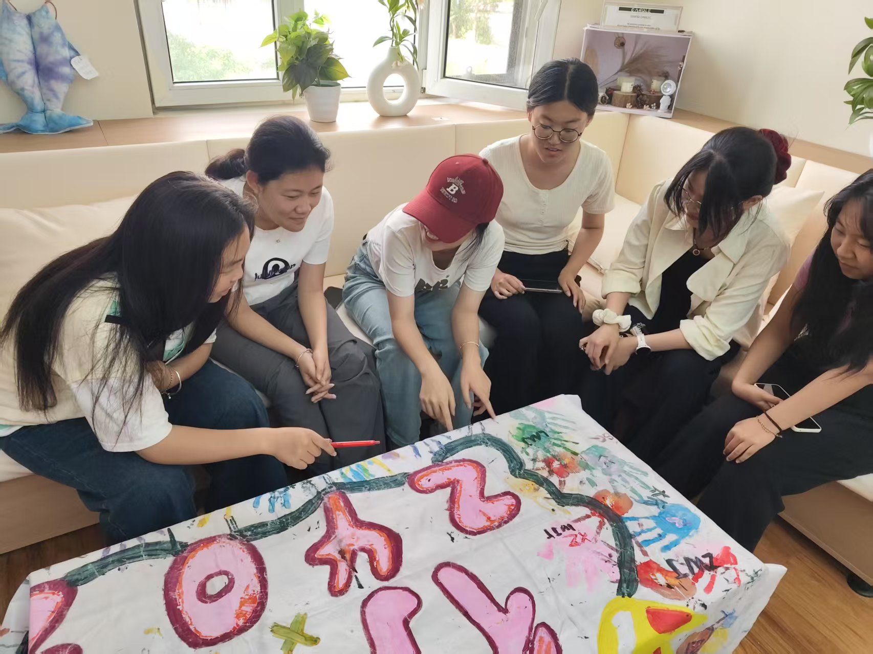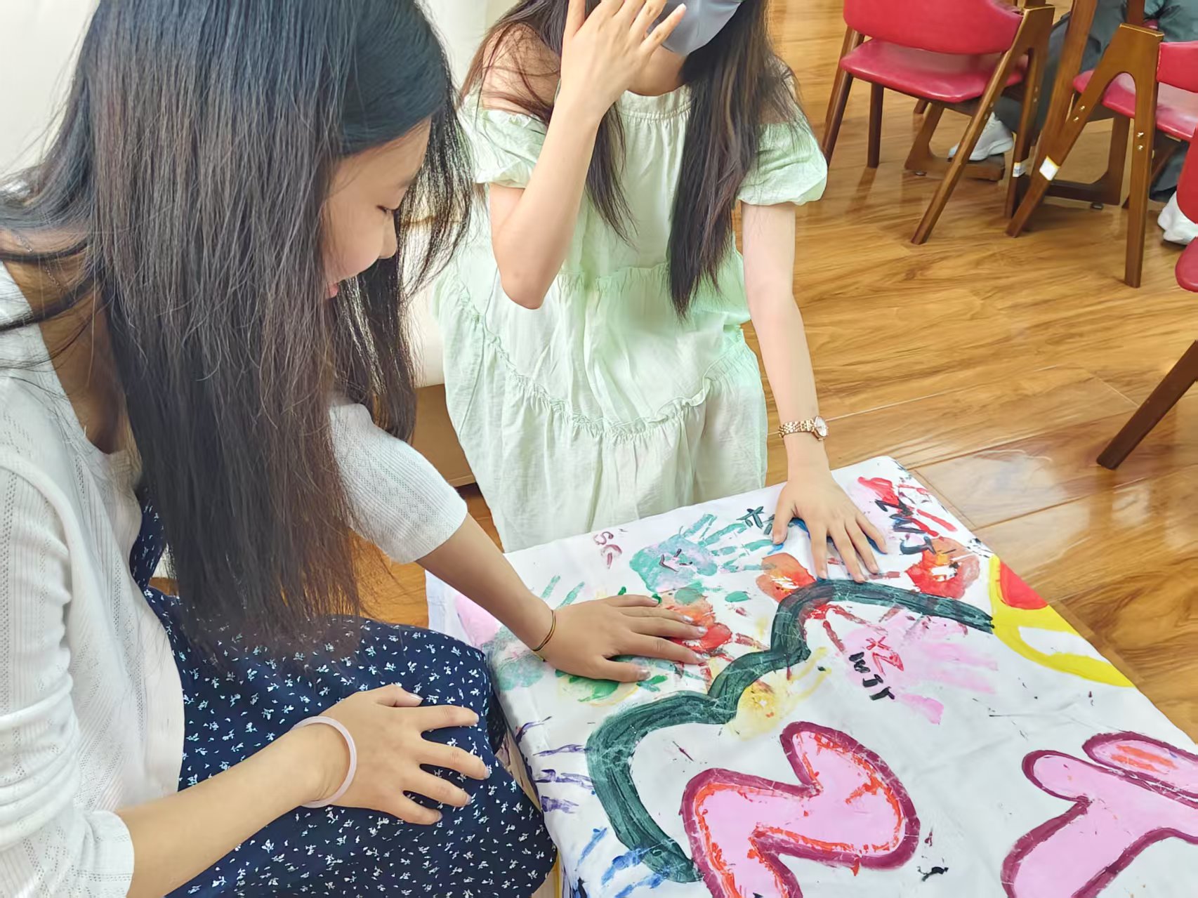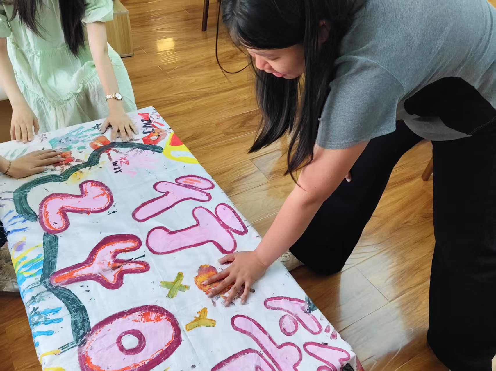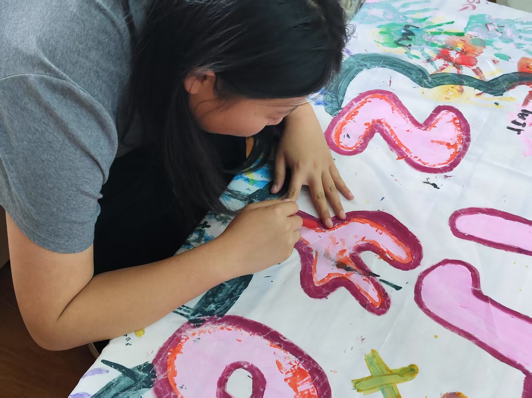 接下来,同学们进入绘制环节。大家分工明确,有的同学负责绘制草图,有的负责调色上色,有的则专注于细节修饰。在绘制过程中,同学们充分发挥自己的特长与想象力,将精心设计的元素逐一呈现在班旗上,两位老师也全程陪伴,为大家提供技术支持与鼓励。当遇到绘制难题时,牛老师凭借丰富的知识与经验,亲自示范,帮助同学们解决技术障碍;张老师则在同学们疲惫时送上温暖的鼓励与关怀,让整个绘制过程充满温馨与欢乐。