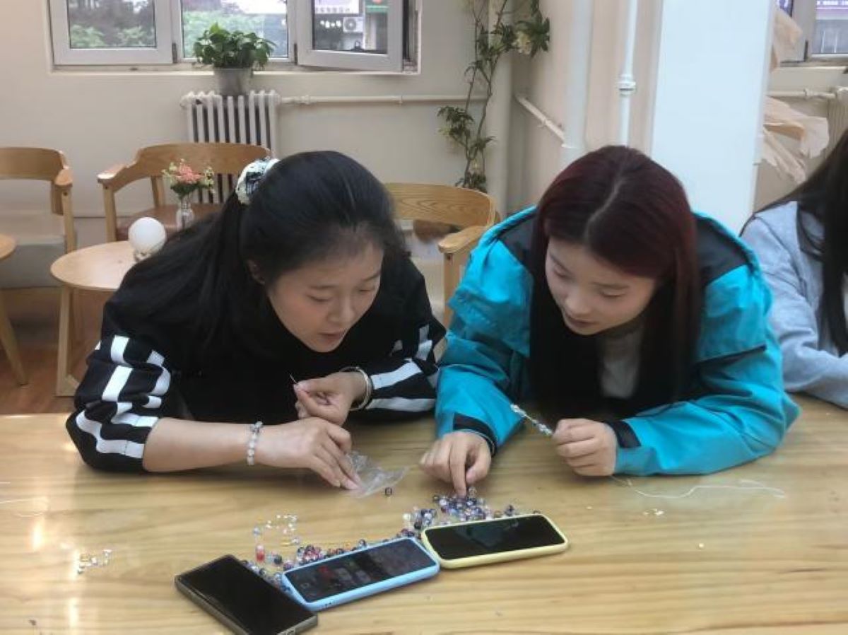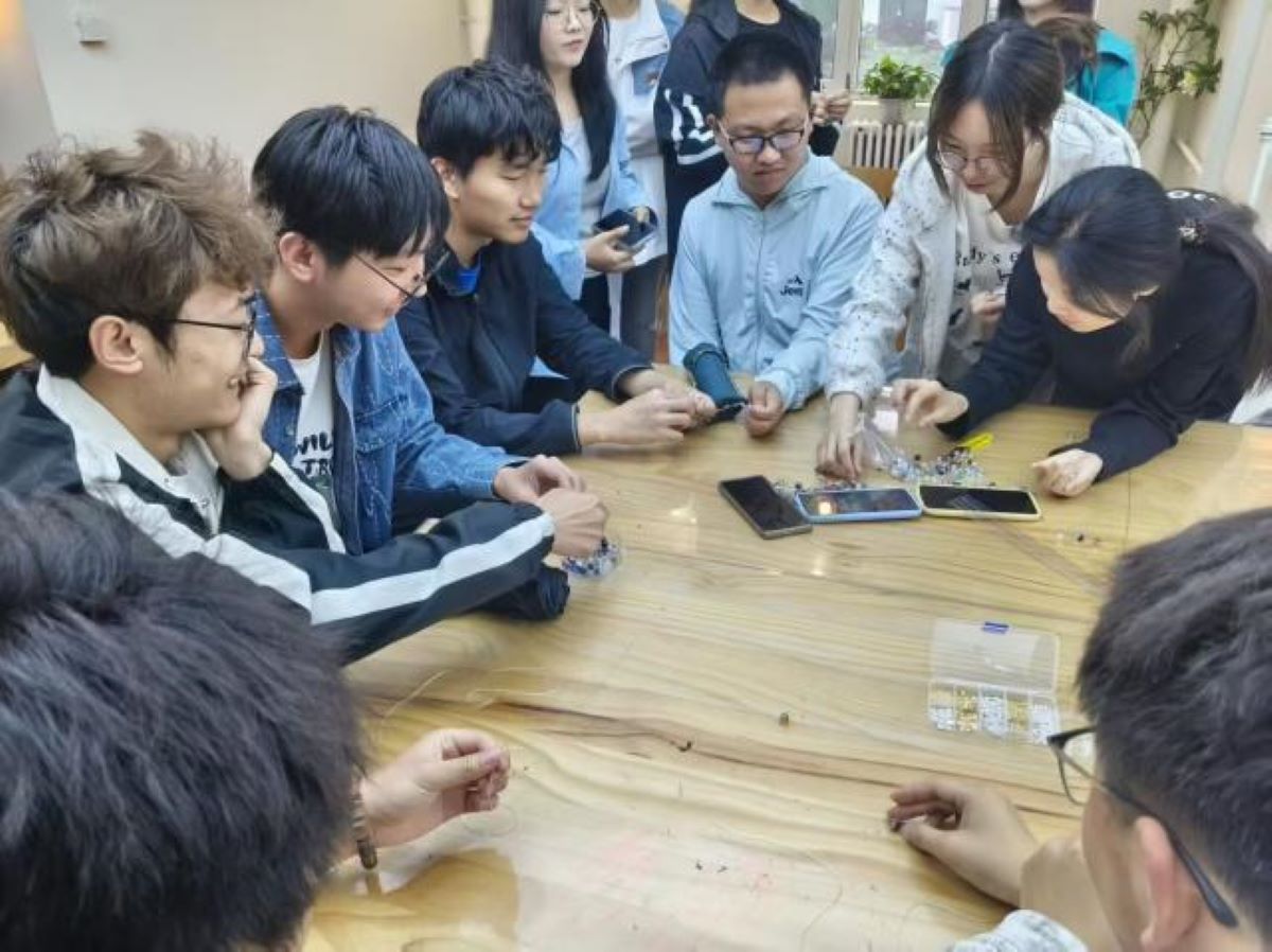 5月24日10:00,科技2401班在创新与艺术交融的奇妙氛围中,于三达书院展开以手链编织艺术展为主题的完满团支部活动。此次活动将传统手工艺与前沿元宇宙概念相结合,为同学们带来了一场别具一格的艺术盛宴。活动时,同学们深入研究手链编织技巧,系统学习平结、金刚结等基础技法,并围绕元宇宙主题,将自然元素、校园生活场景融入设计,编织出充满科幻感的几何图案手链。张锦宜同学表示:“第一次看到手链编织和元宇宙能结合得这么好,这些手链太有创意了,每一条都像是一件艺术品。”同学们借助元宇宙技术沉浸式欣赏手链细节,互相佩戴作品,感受传统工艺的魅力。