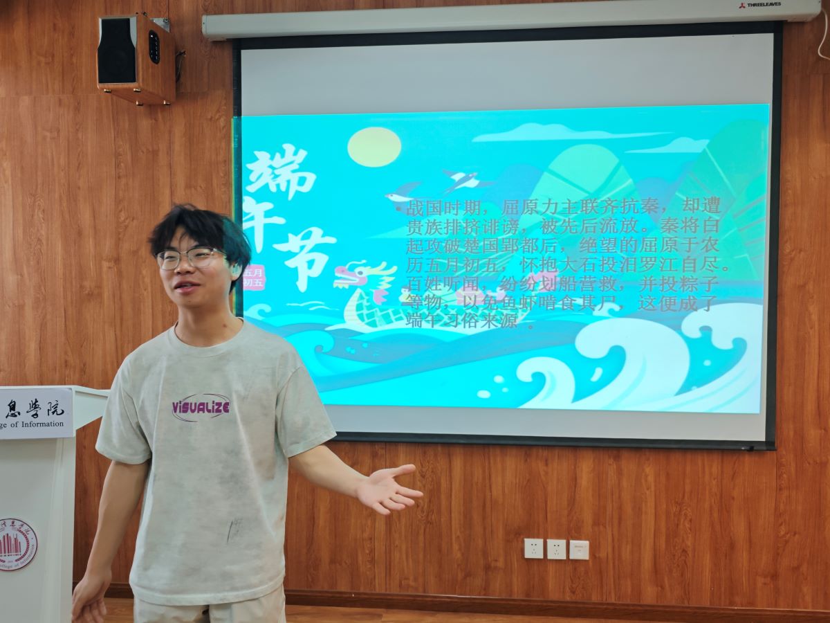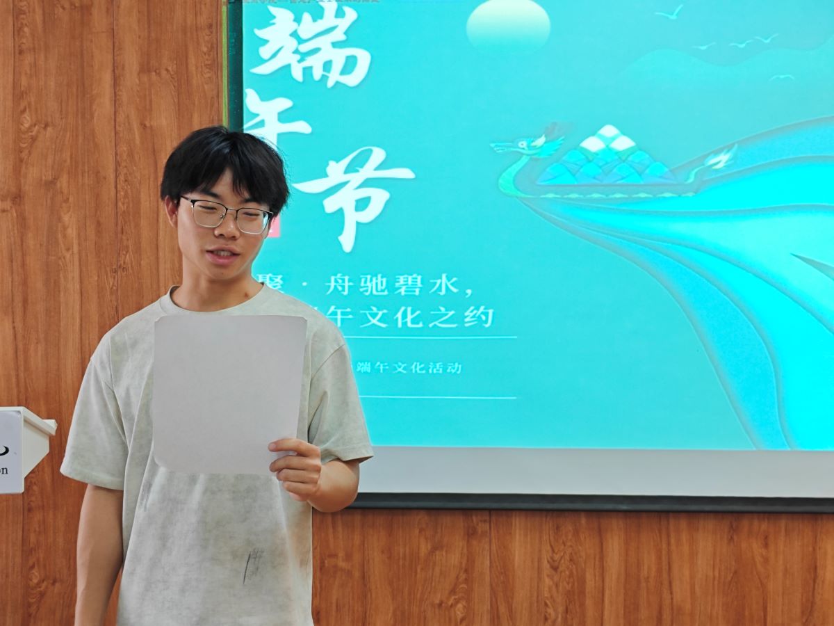 活动在氤氲着传统雅韵的氛围中拉开帷幕。组委石林昊登台讲述端午渊源,以精妙之辞回溯历史长河:从屈原投江的千古悲歌,到挂艾驱邪、龙舟竞渡、角黍飘香的民俗传承,再至龙舟文化中团结奋进的精神内核,层层深入的阐释让传统节日的文化肌理清晰可见,现场掌声如潮,共鸣激荡。