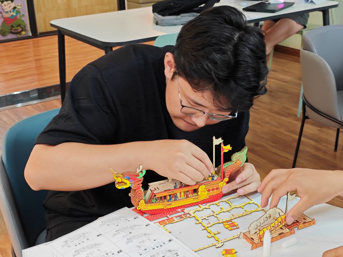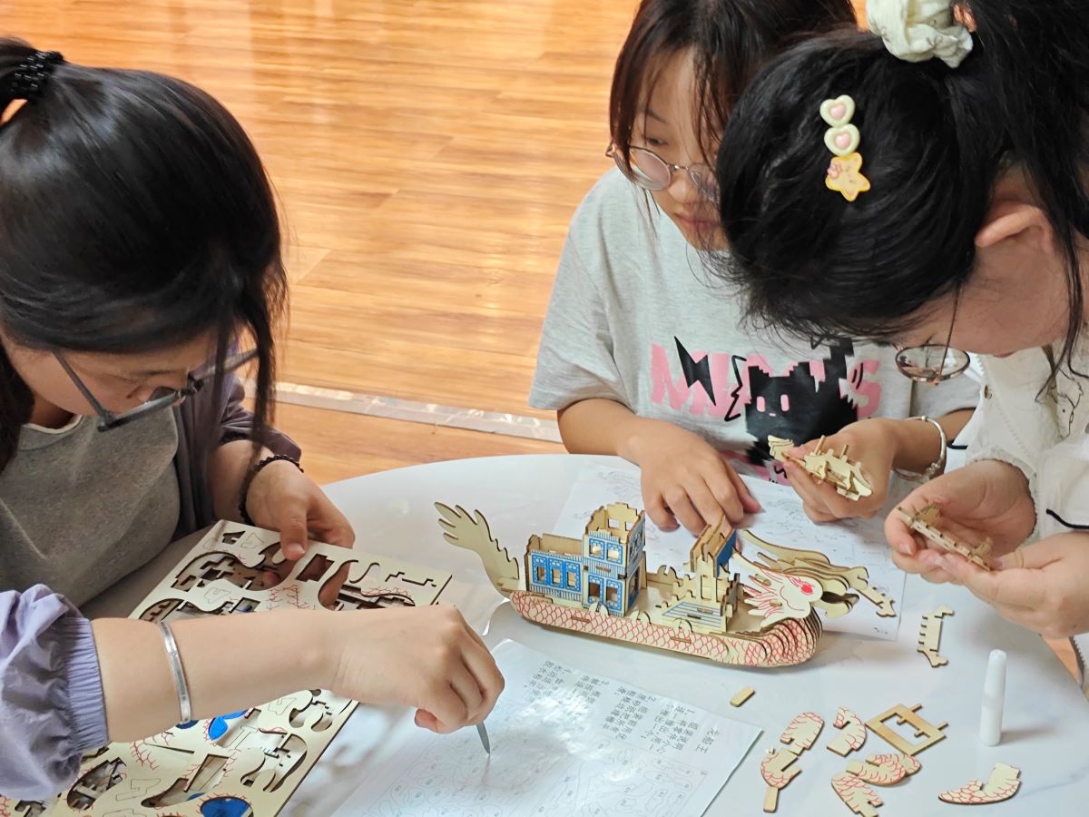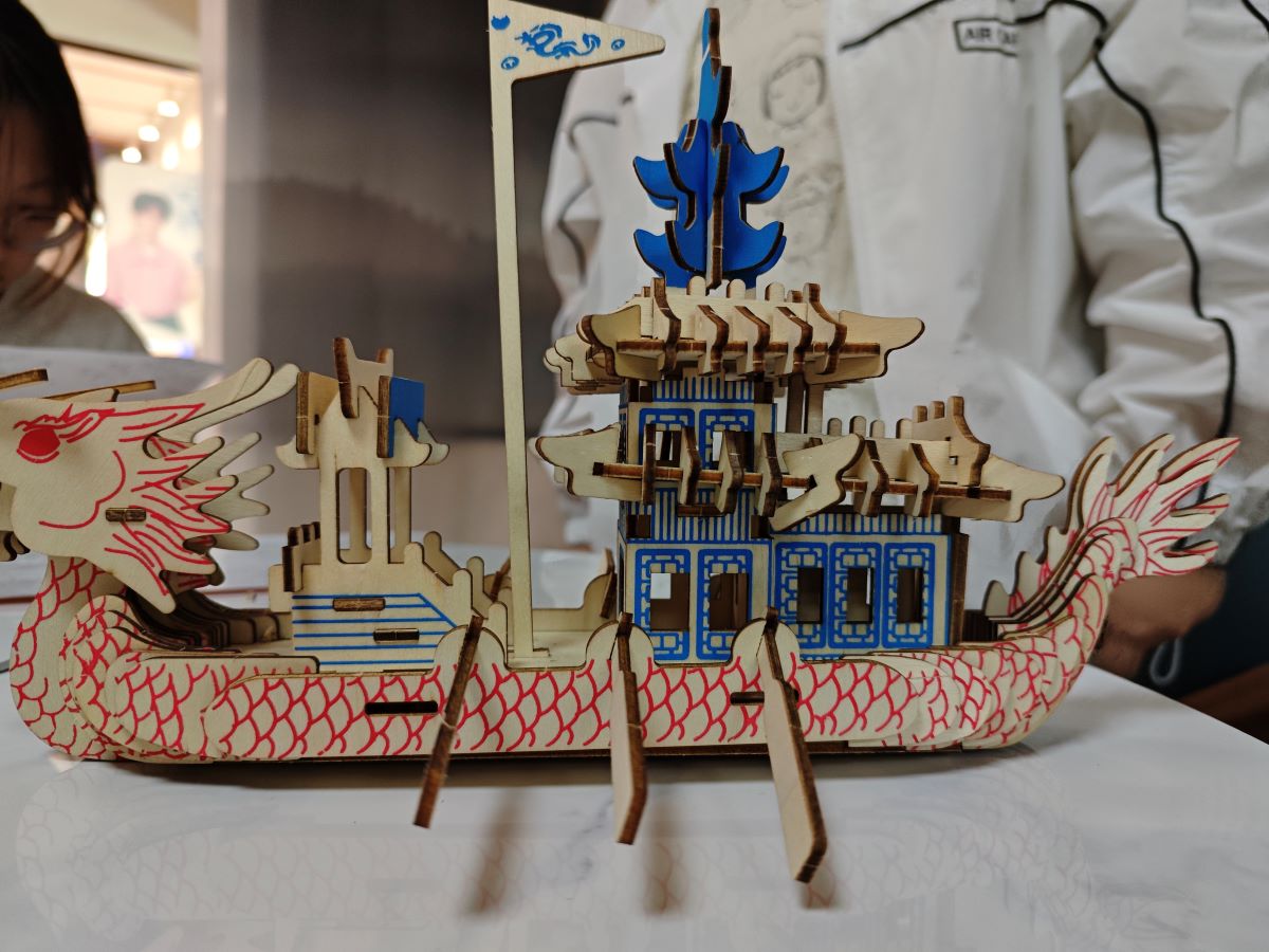 随后,手工创作环节开启文化创新之旅。大厅瞬变创意工坊,龙舟模型套件散发着檀木清芬,积木组件色彩斑斓似待赋灵魂。同学们分组围坐,思维交锋间迅速敲定分工,热烈而有序的氛围中,一场传统与创意的对话悄然展开。