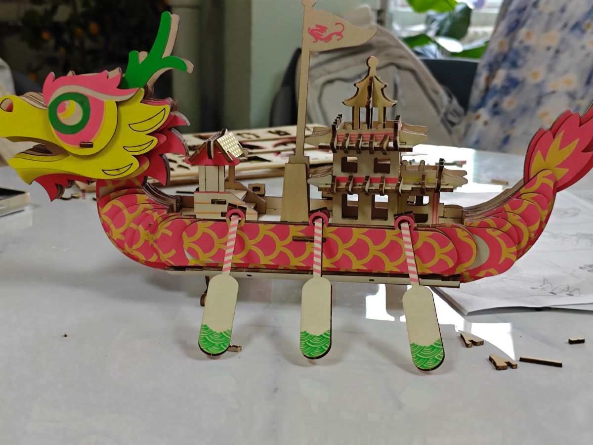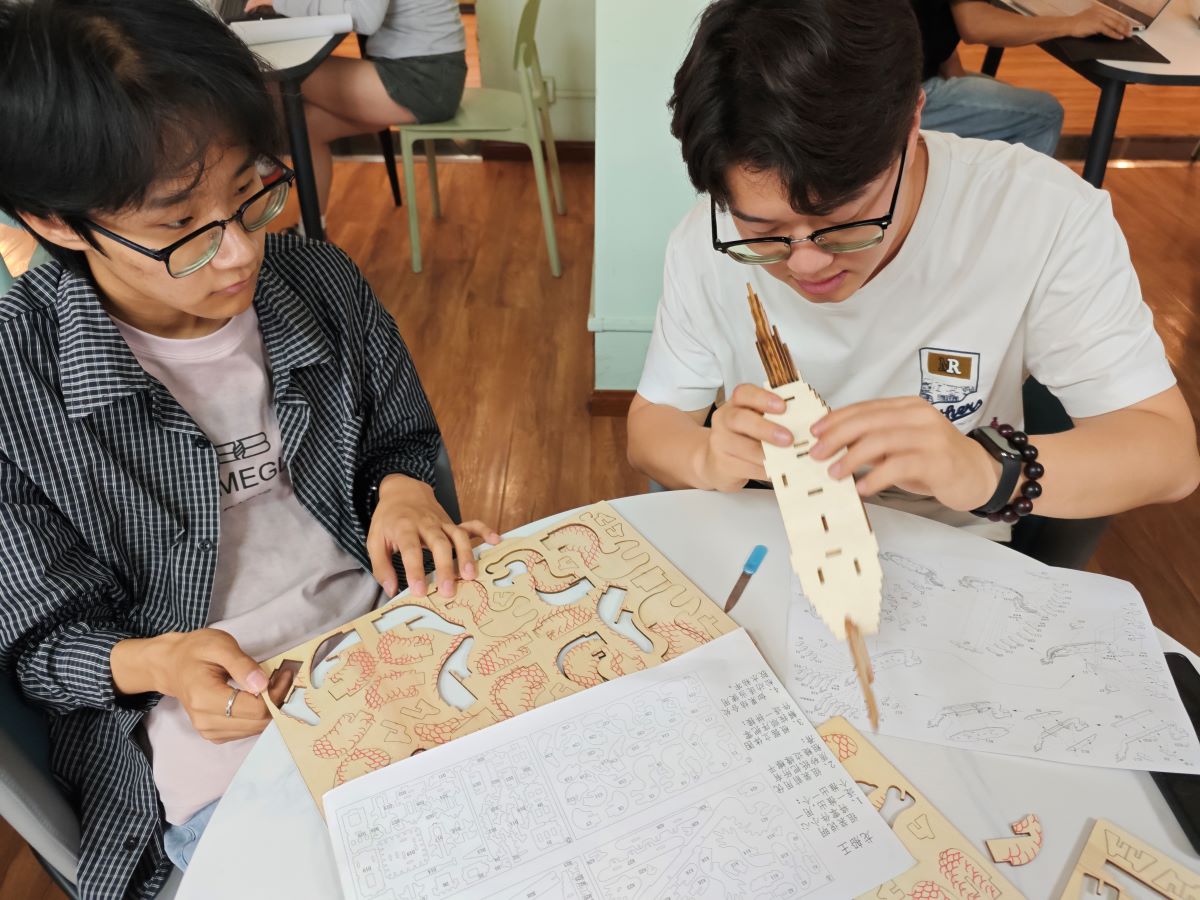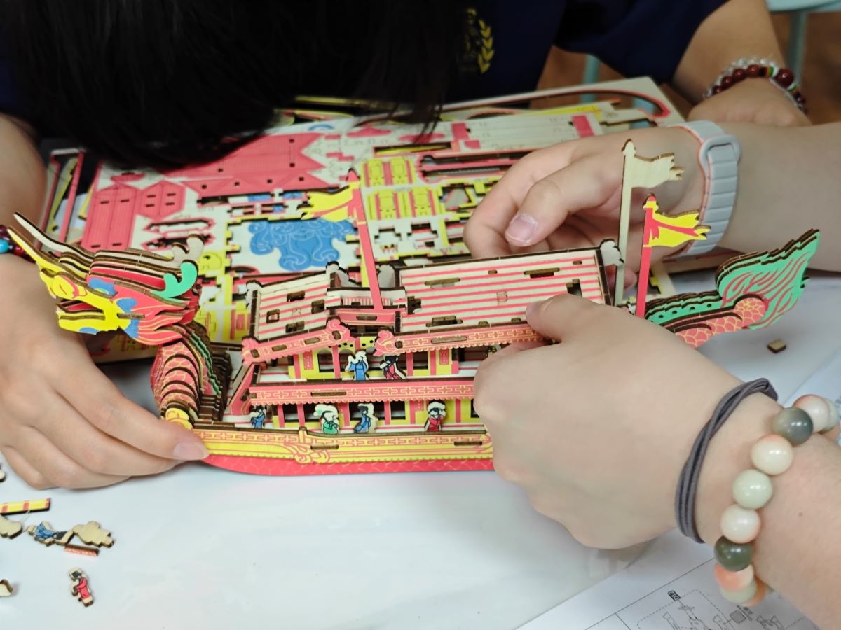 随后,手工创作环节开启文化创新之旅。大厅瞬变创意工坊,龙舟模型套件散发着檀木清芬,积木组件色彩斑斓似待赋灵魂。同学们分组围坐,思维交锋间迅速敲定分工,热烈而有序的氛围中,一场传统与创意的对话悄然展开。