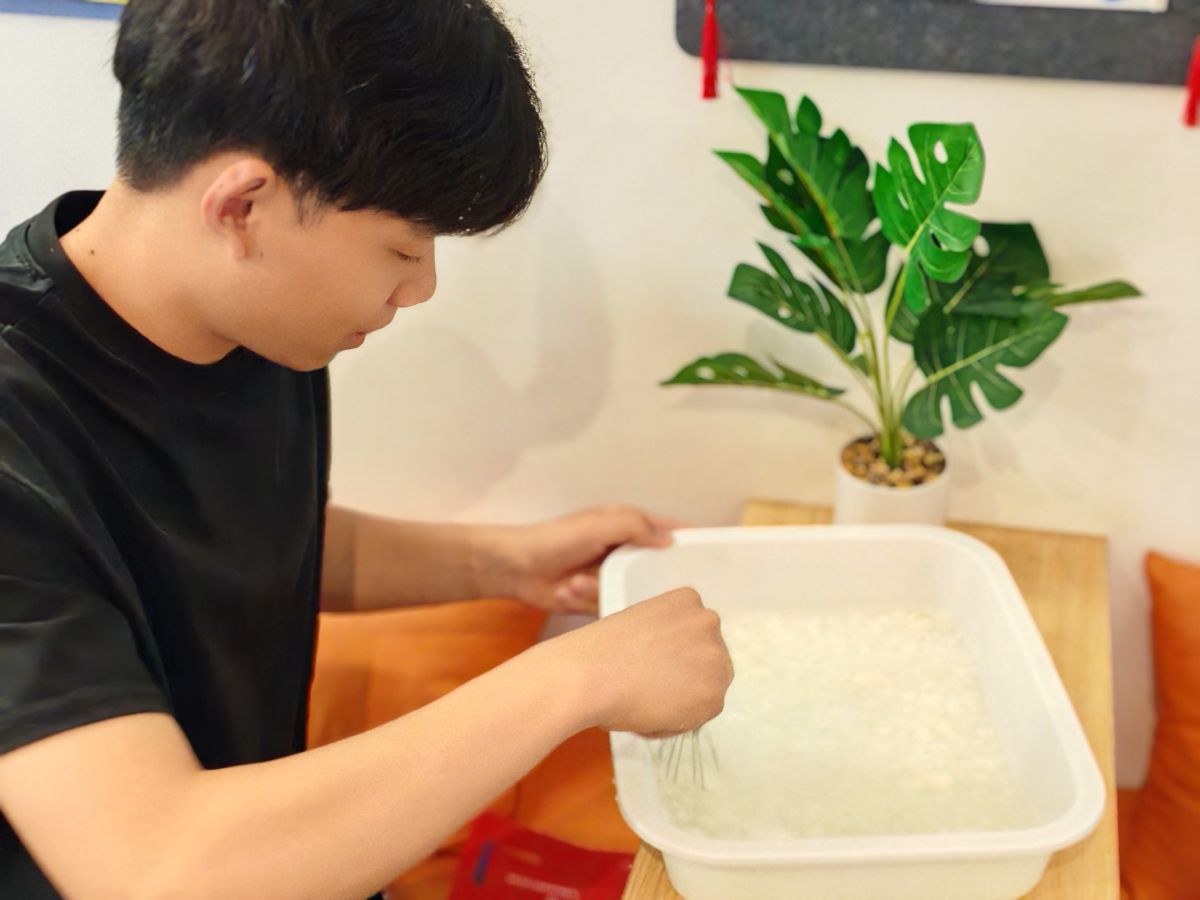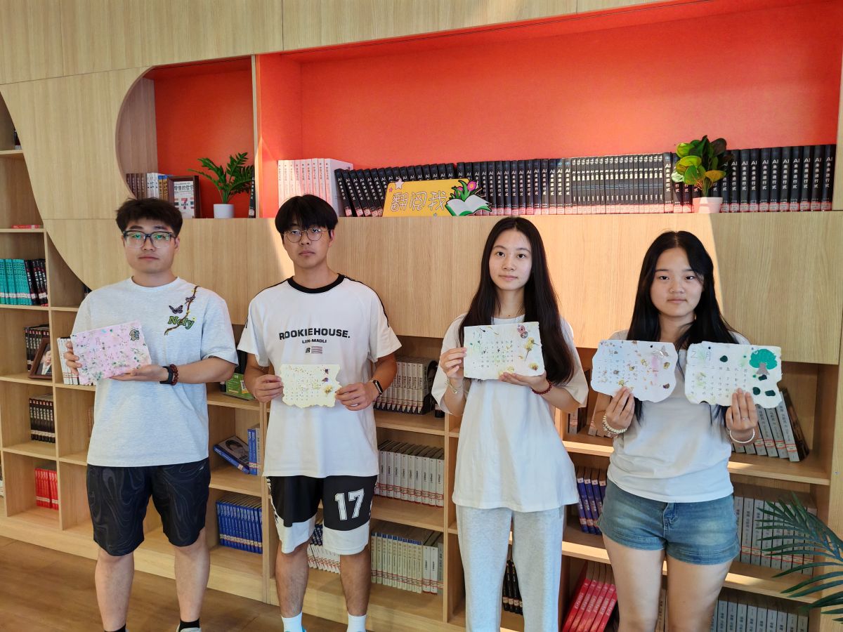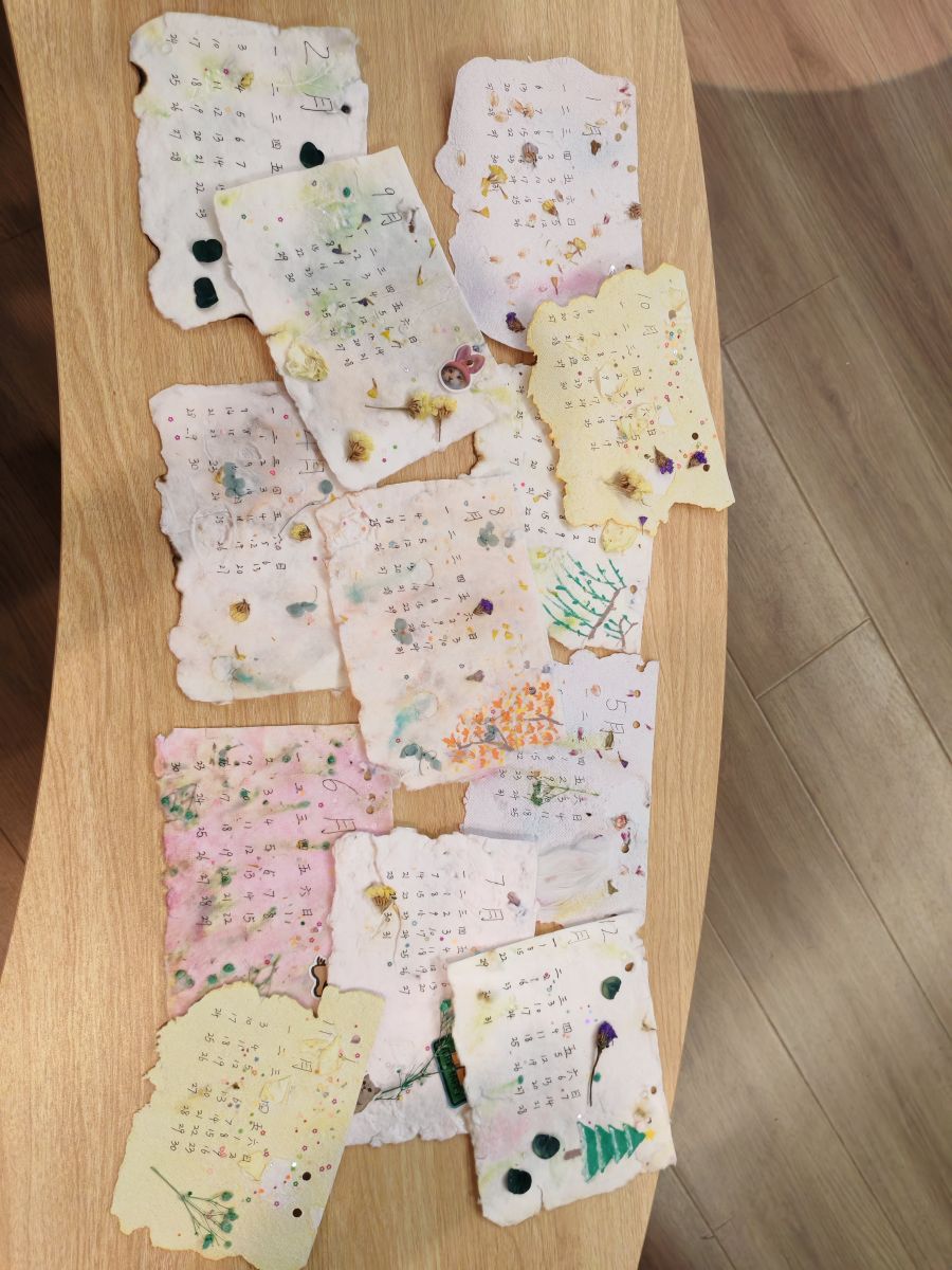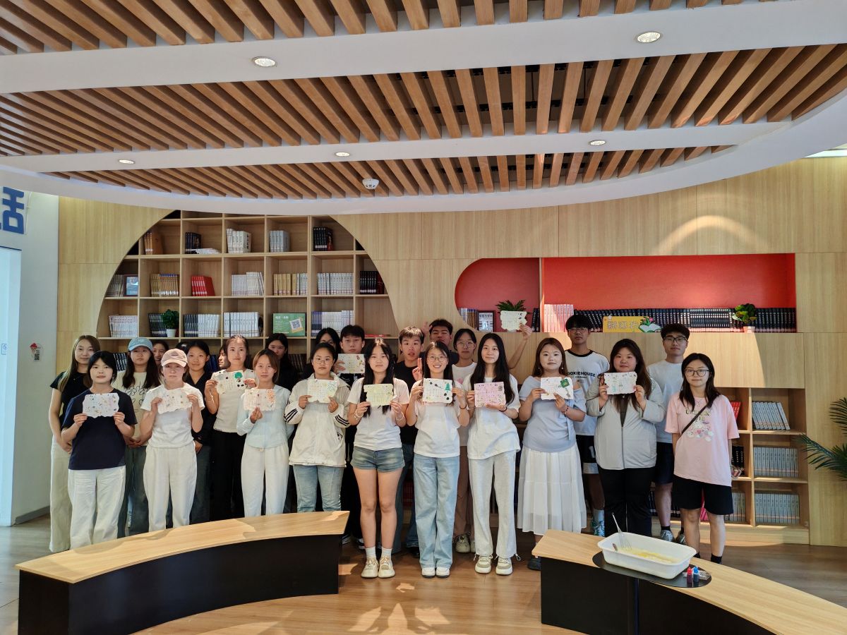 在实践环节,同学们跃跃欲试,纷纷化身“造纸匠人”。大家严格按照铺浆法的步骤进行操作:先将纸浆均匀搅拌,使其如云雾般轻盈散开,再小心翼翼地用勺子在纸浆中轻轻舀取,让纸浆均匀地附着在网框上,形成薄薄的一层。经过挤压、晾晒等工序,一张张独具特色的纸张逐渐成型。过程中,同学们相互协作、交流经验,现场气氛热烈而融洽。贾安琪同学巧妙地将干花、树叶等自然元素融入纸浆中,制作出充满诗意的花草纸。经过一番努力,一张张充满个性的纸张新鲜“出炉”。