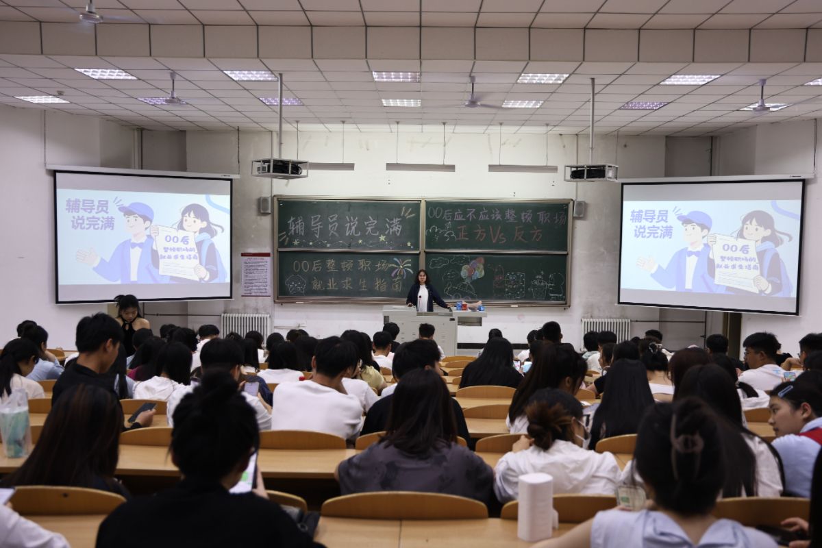 随着“反向PUA”“准点下班”等热词频现,“00后整顿职场”话题热度居高不下。为助力同学们适应就业形势,5月14日18:00,经济与管理学院2024级辅导员毛晓忻老师于博学楼开展以“00后整顿职场前必看的就业求生指南”为主题的辅导员说完满活动。