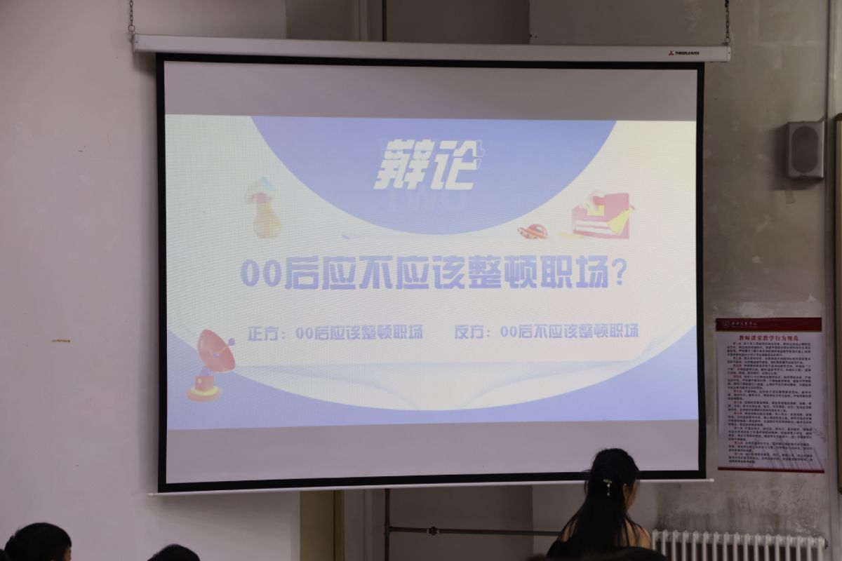 随后,毛老师以“00后是否应当整顿职场”为辩题,组织同学们展开激烈辩论。正方紧扣时代使命,指出职场中形式主义、无效加班、等级固化等问题积弊已久,作为接受高等教育、具备创新思维的新生代,00后有责任通过理性发声与规则化行动,打破职场陈规,推动行业向公平、高效、人性化转型。反方则强调职场需要秩序与沉淀,改革应依托制度优化、代际对话与能力提升,若将“整顿”异化为对规则的全盘否定,不仅可能激化矛盾,更会削弱青年持续推动变革的激情力量。辩论尾声,毛老师总结:“整顿职场的本质是对职场理想生态的追求,唯有兼具勇气与智慧,方能实现真正的破局与成长。”