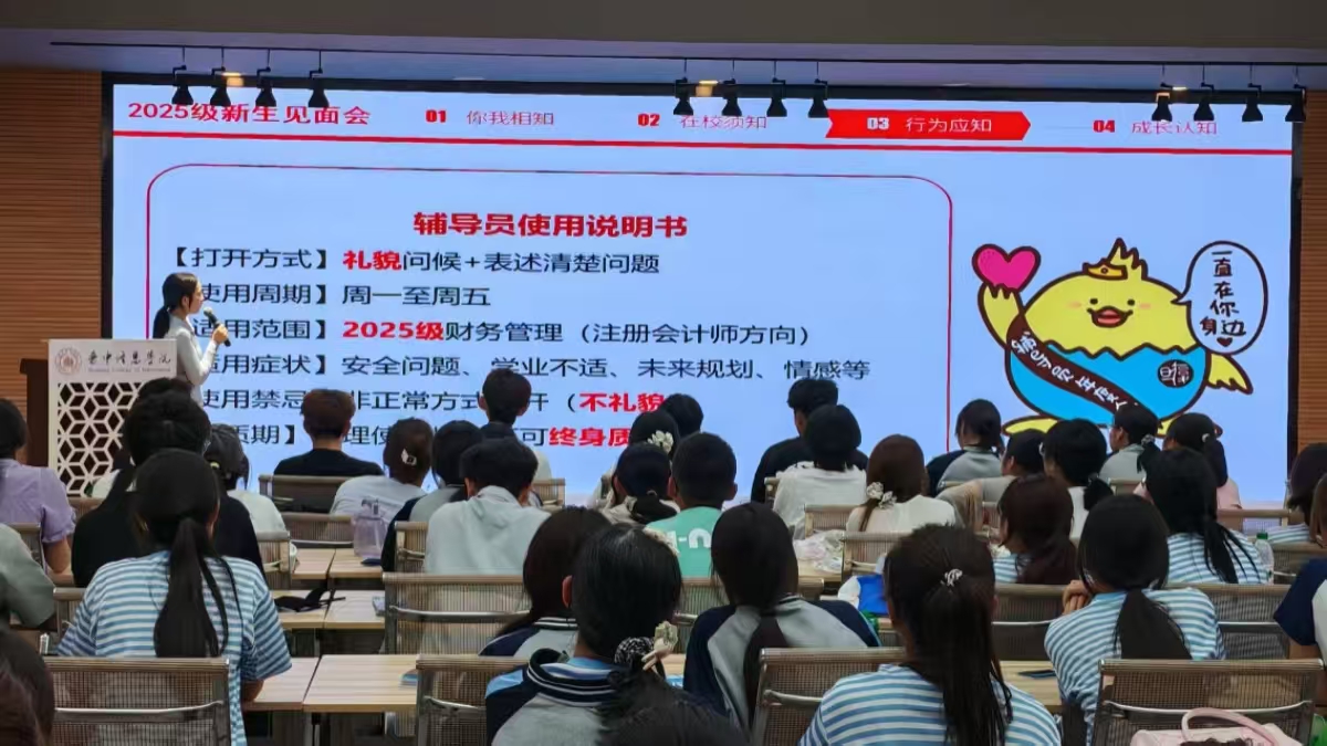 为帮助2025级新生尽快适应大学生活,明确成长方向,9月9日20:00,淬炼商学院·国际商学院2025级辅导员李瑞花开展了以“UP主,请就位!”为主题的辅导员说完满活动,围绕校园生活、行为规范、安全教育、成长认知等方面,在多功能报告厅为财务管理(注册会计师方向)2501-2505班带来了一场干货满满的“说完满”专题讲座。