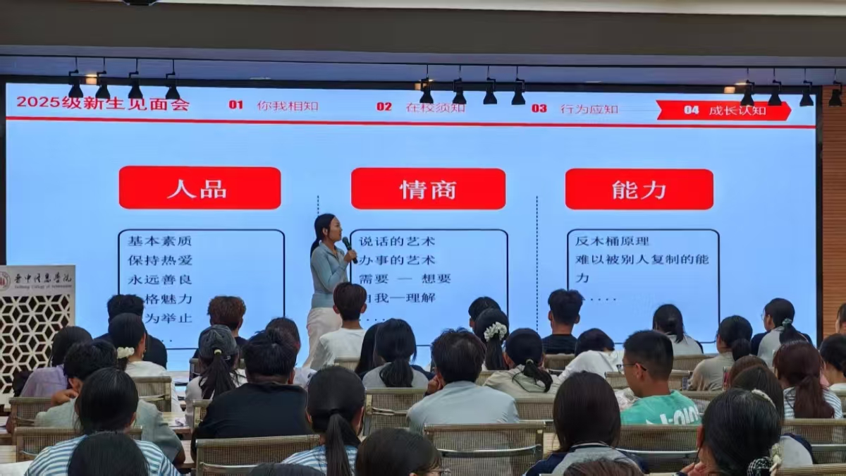 最后,在“成长认知”部分,李老师从人品、情商、能力三个维度,引导新生思考大学成长路径。她鼓励大家保持热爱与善良,修炼说话、办事的艺术,培养难以被复制的核心能力,在晋中信息学院的舞台上找准定位,成为自己人生的“UP主”。