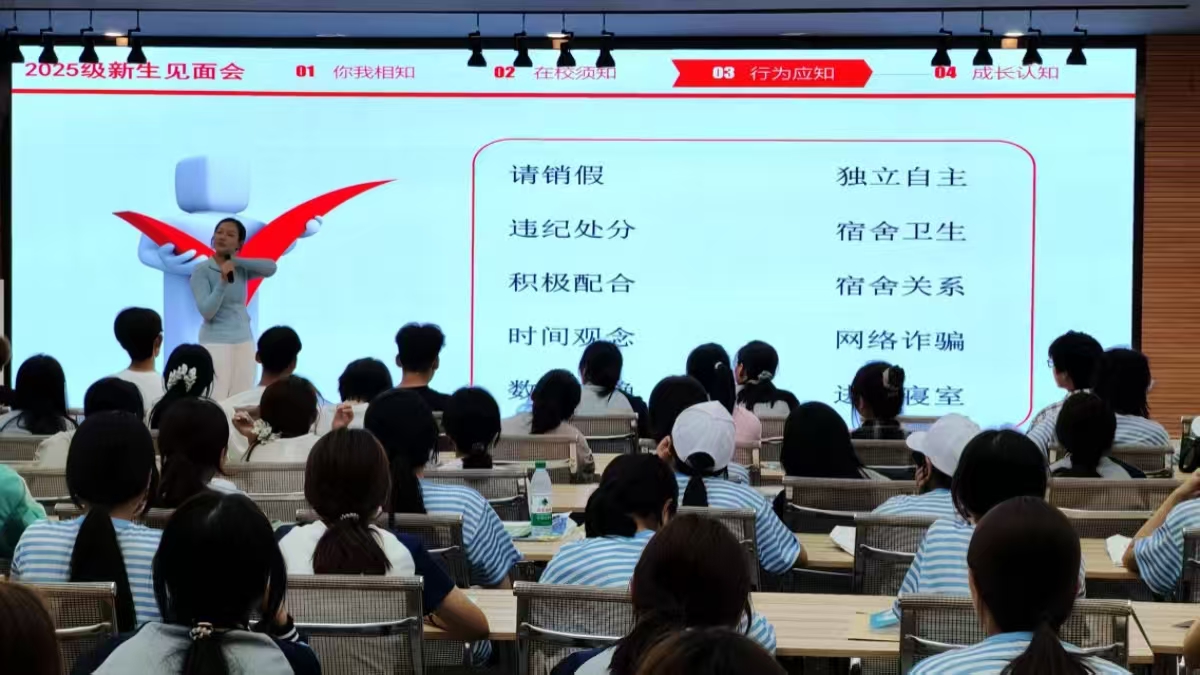 在“行为应知”板块,李瑞花结合《学生手册》,重点解读了考勤请假、违纪处分、完满教育学分、住宿规定等关键内容,同时强调了请销假流程、时间观念、宿舍卫生与关系等行为规范,提醒新生警惕网络诈骗,树立规则意识与安全意识。她还以“辅导员使用说明书”的趣味形式,明确了与辅导员沟通的方式、范围及注意事项,让新生感受到辅导员是他们大学成长路上的“贴心伙伴”。