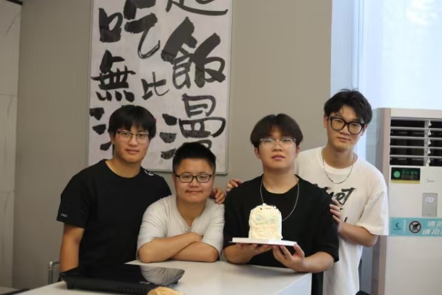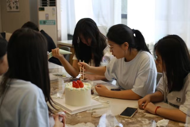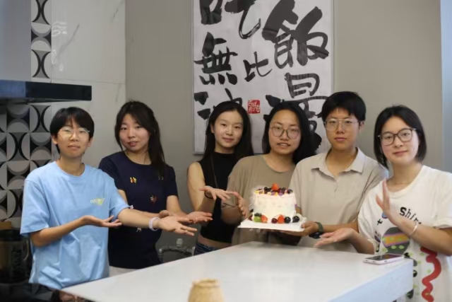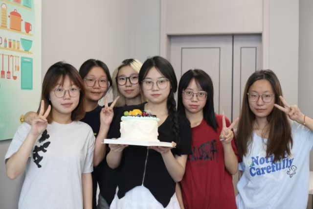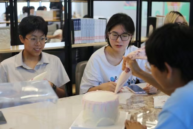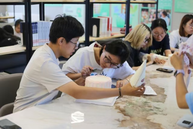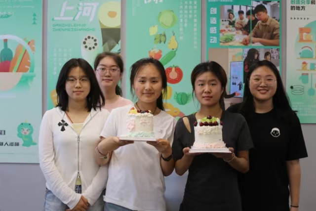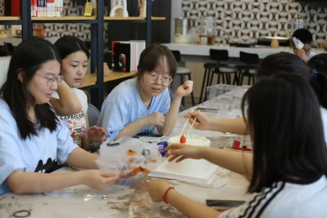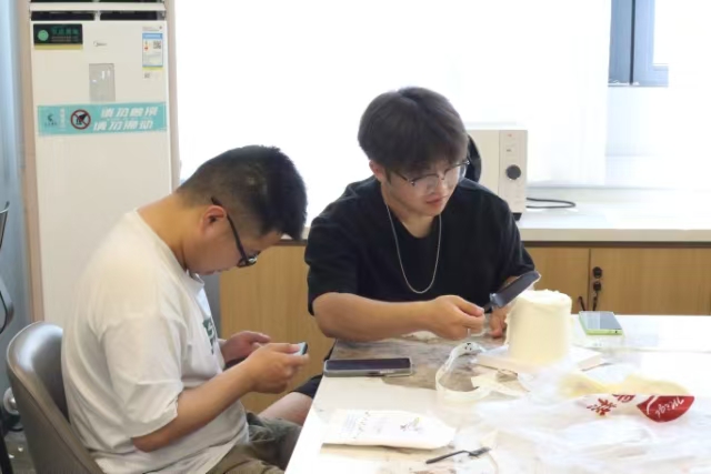 时间在不知不觉中悄然流逝。伴随着一声清脆的“叮叮”声,一件件雕刻精美,栩栩如生的创意蛋糕新鲜出炉,同学们看着彼此的作品纷纷拍照留念,互相分享品尝彼此的作品,并开心的交流制作过程并给予对方诚挚的赞扬。烤箱门开合的微光映亮年轻面庞,集思广益所诞生的作品诉说着这一次值得铭记的团队写作,同学们专注的眼神与额角的薄汗,是团队最动人的注脚。