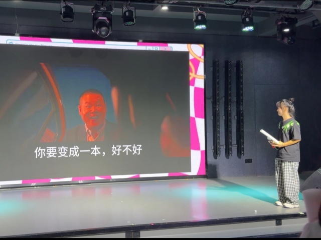当猜歌环节的余温未散,灯光转柔如融化的焦糖,戏剧盲盒带着神秘的呼吸感登场。备受期待的“配音盲盒”环节堪称整场活动的创意担当。活动现场气氛热烈非凡。当盲盒开启,同学们迅速进入角色,用各具特色的声音和幽默演绎,为戏剧片段注入新活力。有的同学以独特方言为角色配音:“信院,饭菜便宜一点;信院,再见的时候升成一本。”瞬间让原本的场景变得妙趣横生;有的同学则发挥创意,加入夸张音效和搞笑台词:“完满活动再多一点。”引得全场笑声不断。