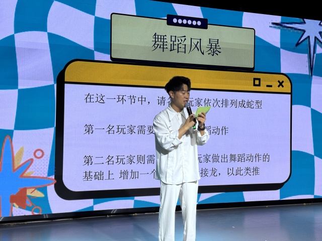 欢快舞曲如电流击穿空气时,终极舞蹈风暴让全场化作流动的星河。蛇形队列里,第一个人比出踩碎烦恼的手势,经十双手的传递,最终在队尾凝成精准的复刻——这场魔性动作接力看似考验肢体记忆,实则是对无拘无束的终极践行:有人把广播操动作编进鬼步舞,有人用机械舞演绎甩开内耗的洒脱。随着接龙轮次增加,动作组合愈发复杂,有小组甚至将广播体操与街舞动作混搭,形成滑稽又充满活力的舞蹈串烧。台上台下形成联动,肢体的律动与欢快的笑声交织,彻底释放了学生们的压力。“平时在教室久坐,跳舞的时候感觉全身筋骨都舒展开了,这种解压方式太直接了!”一位参与接龙的学生笑着说。主持人最后也带头的左踩烦恼、右踢压力舞步,让台上台下连成一片跃动的海。