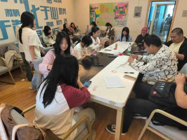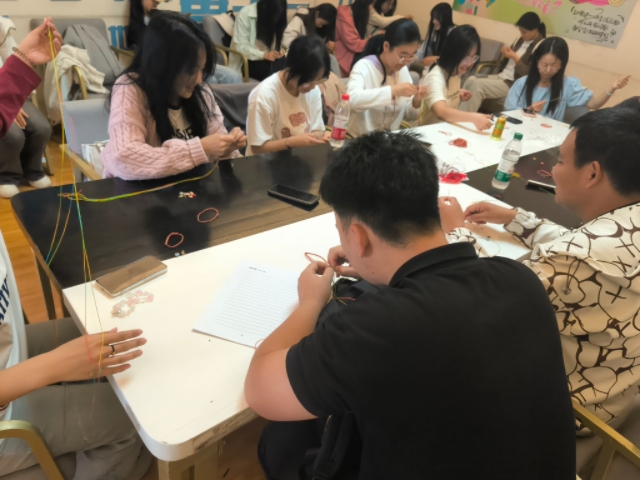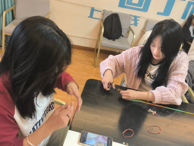 随后,五彩丝线与配饰分发到每位同学手中。大家围坐在一起,热烈讨论着编织技巧。面对五彩丝线,同学们充分利用网络教程,结合自己的手工经验,相互分享、相互学习。现场气氛热烈,不时传来阵阵欢笑声。在大家的共同努力下,一个个精美的平结、雀头结逐渐成型。