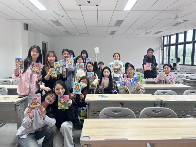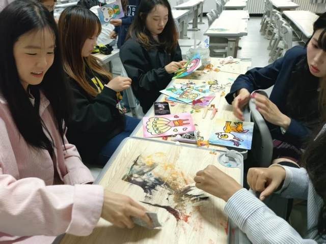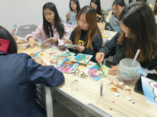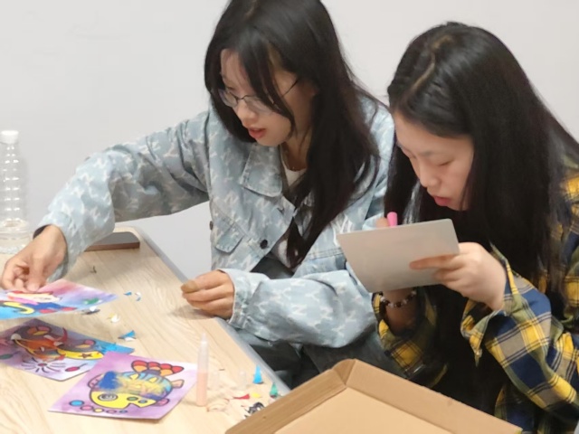 在创作过程中,同学们相互交流、相互启发。有的同学分享自己对色彩搭配的心得,有的同学则传授如何让沙子更好地附着在图案上。整个活动现场充满了欢声笑语,洋溢着浓厚的艺术氛围。