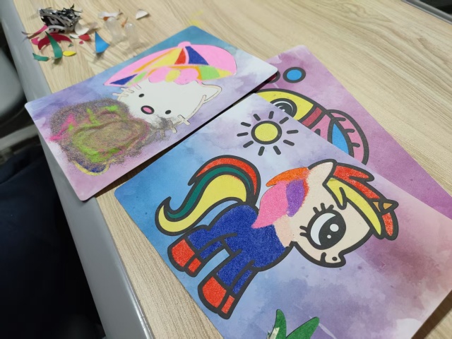 经过一个多小时的精心创作,一幅幅色彩斑斓、栩栩如生的沙画作品呈现在大家眼前。同学们将自己完成的作品整齐地摆放在展示区,互相欣赏、互相点赞。这些作品不仅展现了同学们的创意和艺术天赋,更体现了他们对美好生活的向往和追求。