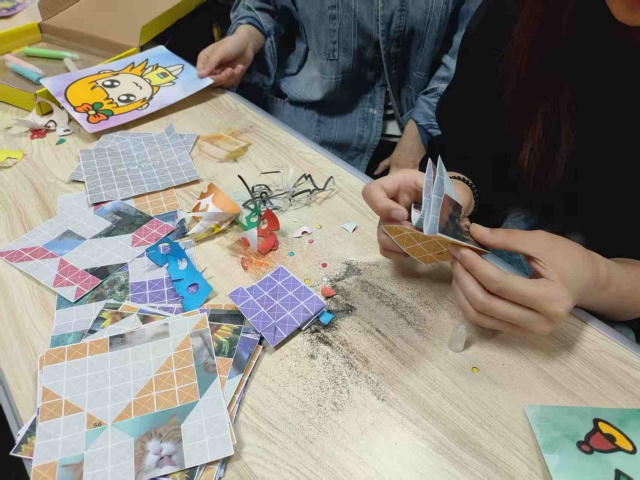 随后,同学们迅速投入到创作之中。桌上摆放着各种颜色的沙子和精心设计的图案模板,从灵动的动物到壮丽的自然景观,从经典的卡通形象到抽象的艺术构图,同学们可以根据自己的喜好自由选择,并用不同颜色的沙子进行填充和创作。