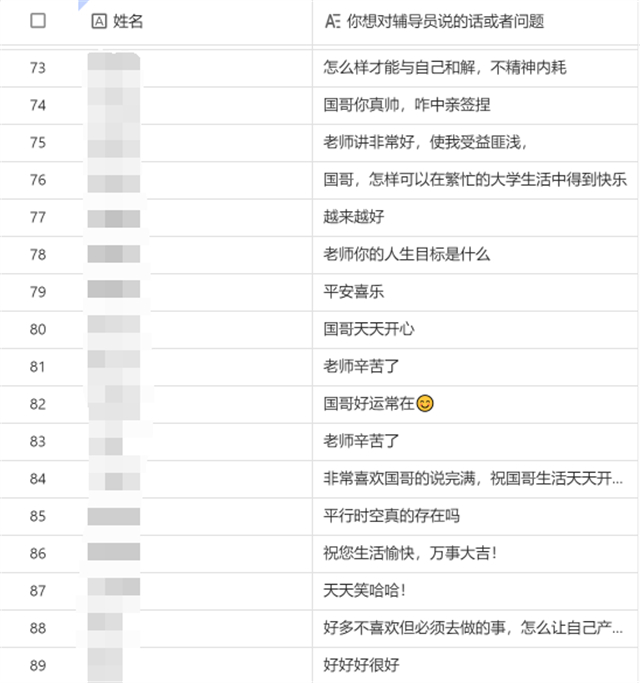 张振国老师通过现场调研,收集同学们想对自己说的话和遇到的问题,并回答了同学们关于学习、生活的困惑,也引导学生们怎么反击别人的PUA,鼓励要用幽默来化解尴尬,以适当的方式对对方巧妙反击,试着掌握主动权。这次的辅导员说完满活动圆满结束,张振国老师也对同学们的表现给予了高度评价,他希望同学们能够以这次活动为契机,更好地认识自己,珍惜现在,展望未来,为自己的完满人生打下坚实的基础。