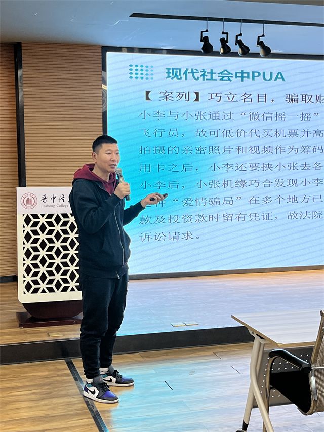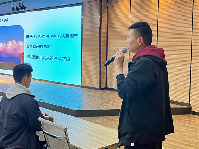 随后张振国老师用亲身经历向同学们讲了他自己所遇到过的PUA,并告诉大家PUA的危害:心理健康受损;人际关系破裂;失去自我认识;社会信任危机等。还邀请了一位同学来讲述他身边有没有别人PUA他的。同学分享了自己的故事和感受并表示:“身边有类似的事情发生过。”然后张振国老师就告诉大家破解PUA的办法就是:学会接纳自己的不完美和失败,用积极的方式看待挑战和困难,保持心态平和和积极向上。