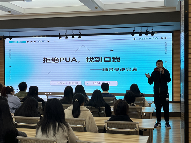 PUA,从最初诞生之时的恋爱社交技巧,演变成今天的精神控制术,它所带来的伤害,远远超出我们的想象。为了学习认识到什么是PUA,了解怎么反抗别人的PUA,3月13日21:00-22:00,淬炼·国际商学院辅导员张振国于多功能报告厅为财务管理2201-2205班的学生开展以“拒绝PUA,找到自我”为主题的辅导员说完满活动。