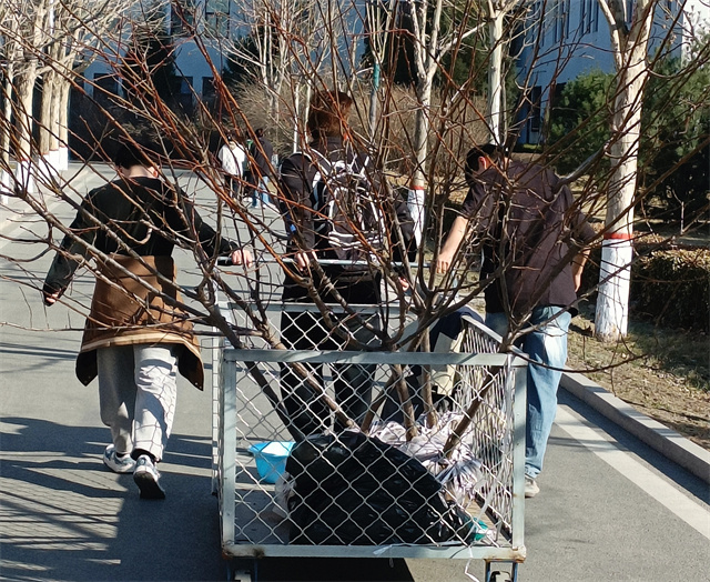 活动前期,班委们积极联系太谷当地的花卉市场,在班级中投票挑选适合种植的树种,杏树苗在一众“候选者”当中脱颖而出。植树节清早,男生们兴致勃勃地推着车迎接树苗“回家”。