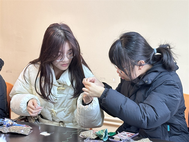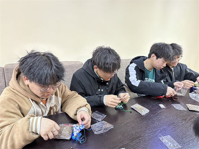 在活动中,同学们积极参与,精心挑选出自己心仪的香囊样本和自己所需的材料,开始动手制作。在此期间,欢声笑语与唉声叹气,此起彼伏。同学们或沉寂于将香囊成功缝合的喜悦,或在穿针引线、固定中国结时抓耳挠腮,状况频出,现场可谓是妙趣横生、热闹非凡。