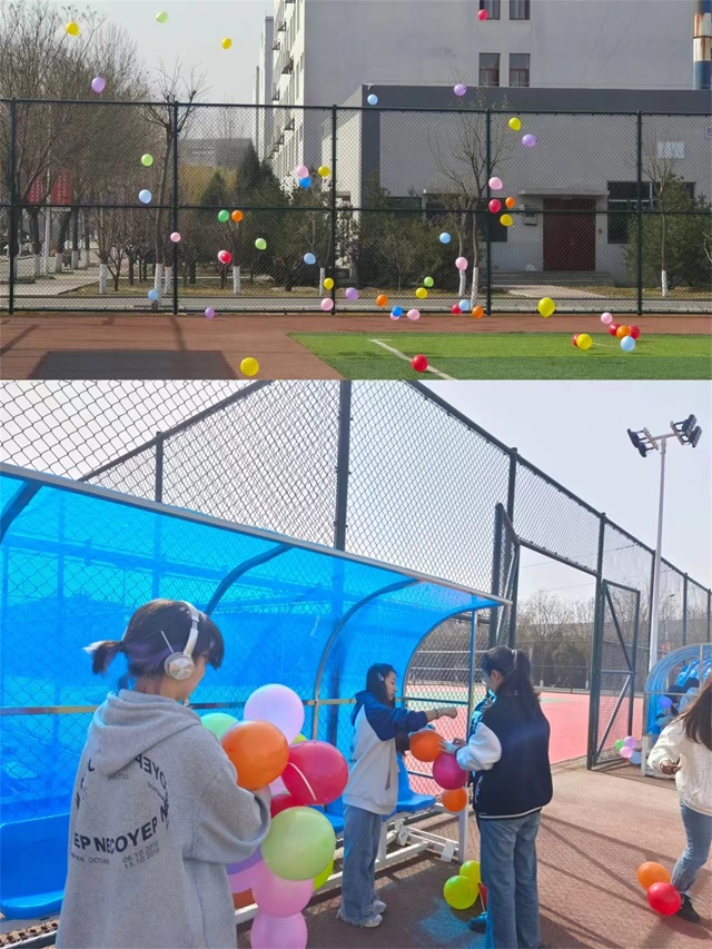 在打气筒的加持下,同学们手中成型的气球越来越多。微风不燥,阳光正好。气球轻盈的飘在空中,似乎与纯净的蓝天融为一体,让人心旷神怡。随着气球的飞起,同学们的热情更加高涨,追逐着飞起的气球,嬉戏打闹,好似一幅春和景明的画面。鼓起的气球形状不一,有的像个“不倒翁”站不住脚,有的在风的帮助下跳起了“舞蹈”,同学们也认真对待着自己的“气球宝宝”。