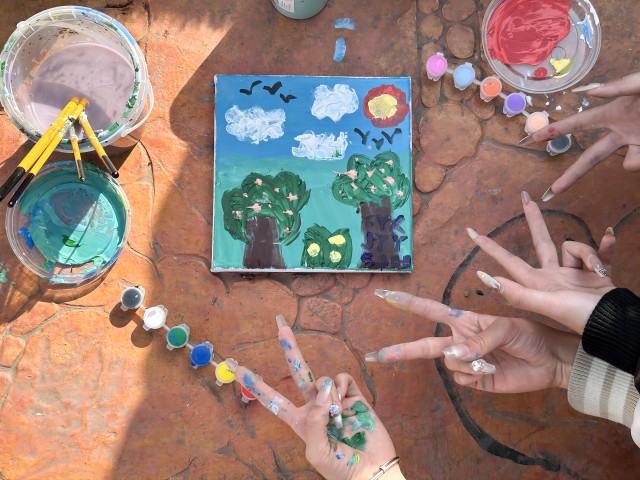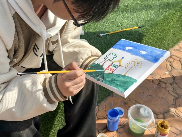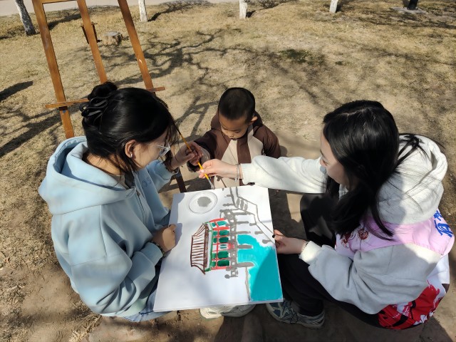 与此同时,童绘乐园组承担起了教小朋友配色的任务,他们耐心地指导着这群祖国的花朵如何选择颜色、搭配色彩,学会从自然中寻找灵感,小朋友们看着面前的大朋友们,露出了崇拜的眼神。大家或蹲或站,或远观或近察,在画板上勾勒出轮廓,用心感受着春天的气息,用画笔描绘着春天的色彩。