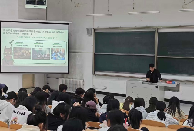 “我们之所以会纠结于理想与现实的差距,本质上是因为害怕走出自己的‘舒适区浪浪山’。”辅导员刘家辉的一句话点醒了在场同学。他表示,舒适区虽然让人感到安全,但也会限制成长,而大学正是突破自我、探索可能性的最佳阶段。为此,他向同学们提出三点建议:一是主动切换状态,告别假期的松散模式,以“归零”的心态制定新学期的学习与生活计划;二是勇敢迎接挑战,积极参与社团活动、学科竞赛等,通过组队合作的“冒险”模式,在实践中提升能力,同时加强与同学的交流,共同建设有归属感、有凝聚力的班级共同体;三是拒绝拖延内耗,牢记“行动永远比完美更重要”,不必等“准备好”才开始,从整理宿舍书桌、完成一份作业、主动和同学打声招呼等小事做起,用行动一点点缩小理想与现实的距离。