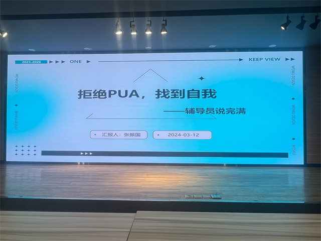 PUA,从最初诞生之时的恋爱社交技巧,演变成今天的精神控制术,它所带来的伤害,远远超出我们的想象。为了学习认识到什么是PUA,了解怎么反抗别人的PUA,3月13日21:00-22:00,淬炼·国际商学院辅导员张振国于多功能报告厅为财务管理2201-2205班的学生开展以“拒绝PUA,找到自我...