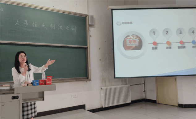 2023年5月17日下午的培训内容主要是人事管理相关制度的讲解:分为员工关系、薪酬福利、绩效考核、培训开发、职称评审五个部分。分别由人力资源处负责这五项工作的张恺翔、李洋、张旭、张鑫、郭亚琴等五位老师做了相关制度、政策方面的介绍和解读。主讲老师的培训内容细致入微、针对性强,与会的新教师在认真听讲的同时,也结合个人实际提出了关心的问题。主讲老师秉承着“竭诚服务”的工作态度,对问题逐一进行了耐心解答,对提高人事工作的实效性有很重要的作用,新入职教师通过培训学习也充分了解了人力资源处各模块协调运作的关系和方式。