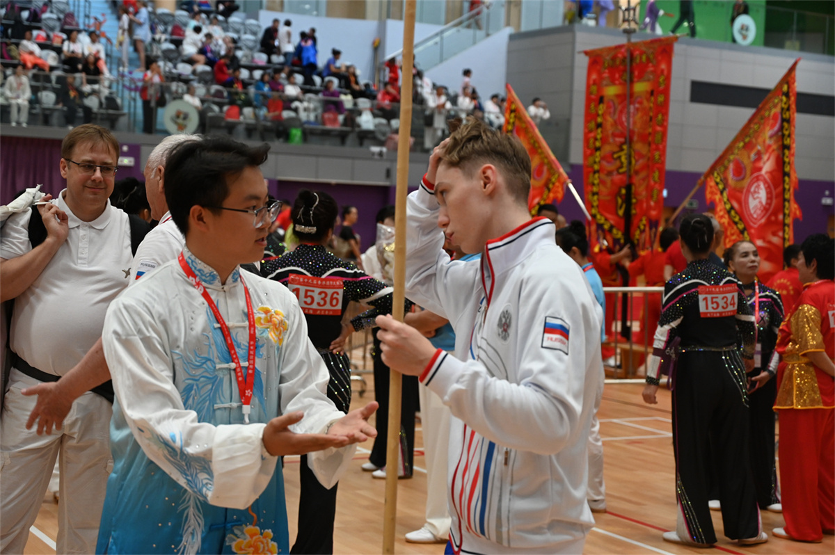特别值得一提的是,信院武术队与俄罗斯国家武术队进行了激烈的较量。尽管队员王鹏程和张珍铷在比赛中惜败于俄罗斯选手Khaliliulin kamil和Stashkov Vladimir,但他们的精彩表现赢得了现场观众的热烈掌声和高度评价。
