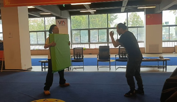 为了让大家更直观地感受“内力”的威力,农永特别邀请了团队中的李雅亮和黄鑫两位担任现场小助手。两人双手紧握厚厚的防护垫,神情专注地站在他面前。演示开始,农永双脚稳稳扎地,呼吸沉稳,手臂靠向垫子上。下一秒,李雅亮便像被一股无形的力量猛然推动,整个人“咚”地一下失去平衡,在地上连滚两圈才勉强稳住身形。他忍不住感叹:“农永的力量真是强悍啊!”轮到黄鑫时,他刚与农永的手掌接触,便感到一股力量扑面而来,身体不由自主地后退两步,才稳住重心。他抬起头,竖起大拇指,对农永的功力表示由衷的钦佩。