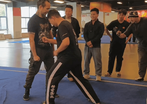 这场交流不止于武术技艺的切磋,更延伸到了武侠小说中令人好奇的“内力”探索。主唱农永主动邀请队员们用力击打自己的腹部,亲身体验“内力”的玄妙,随着“砰砰砰”几声闷响,队员们卯足劲出手,却没一个人能让农永感到半分疼痛,反倒是出拳的队员们,纷纷觉得拳头像砸在了坚硬的石头上。面对众人的惊讶,农永现场解释,这并非神话中的“刀枪不入”,而是通过长期训练形成的“卸力”技巧——将对方的力量引导、分散到全身,从而化解冲击。他强调,所谓“内力”,其实是呼吸、筋骨与意念的高度配合,是多年修为的综合体现。