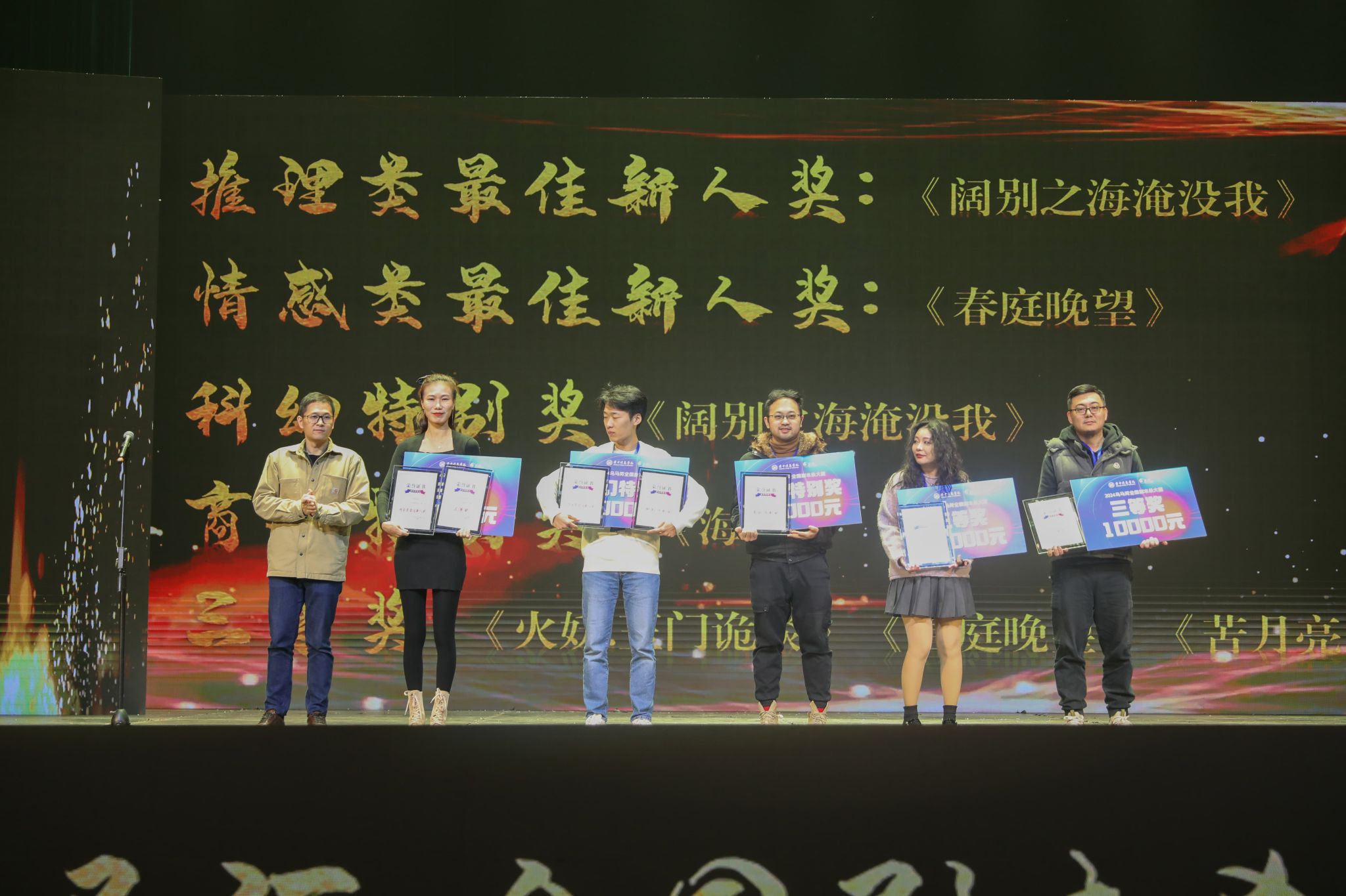 晚会节目后颁奖仪式正式开始。一等奖由晋中信息学院常务副校长刘正国颁奖。二等奖由晋中信息学院副校长常彦阁颁奖。三等奖、情感类最佳新人奖、推理类最佳新人奖、商战特别奖、科幻特别奖由表里山河工作室创始人、剧本杀创作者伯爵大人林楚栋老师颁奖。入围奖由蛛丝马迹工作室创始人高薇老师颁奖。