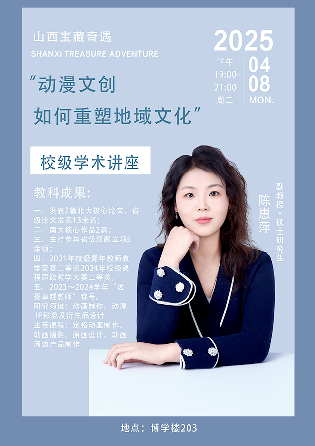 4月8日19:00至21:00,博学楼203内座无虚席,一场以“山西宝藏奇遇:动漫文创如何重塑地域文化”为主题的精彩讲座在此圆满举办。本次讲座由艺术传媒学院动画教研室陈惠萍副教授担任主讲,动画教研室主任贺跃龙主持,动画专业24级学生、在校毕业生和专业教师现场聆听学习。本次学术讲座深入剖析了动漫文创在传承与创新山西文化进程中的关键作用,吸引了众多师生及文化爱好者到场聆听,现场互动交流热烈,学术氛围浓郁。
