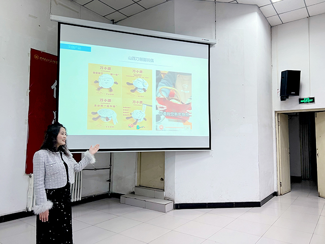 讲座中,陈惠萍老师借助丰富的应用案例,生动展示了山西动漫文创在建筑、文物和美食三大领域的实践成果。在建筑领域,从纸雕的工艺设计角度,讲解如何通过立体雕刻精准还原古建筑斗拱结构,同时结合AR技术,将历史故事以动态形式呈现。对于悬空寺纸雕文创,陈老师从多层镂空工艺的制作难点与突破点出发,阐述如何通过精湛工艺还原其险峻姿态。在文物领域,在设计晋侯鸟尊毛绒玩具、“比耶龙”冰箱贴时,分享了从文物原型到文创产品的设计转化过程,讲解如何保留文物特色元素并进行趣味化处理,拉近公众与文物的距离。在美食文化方面,“刀削面玩偶”“枣花馍挂件”等文创产品,陈老师讲解了从造型设计、色彩搭配到市场推广的全流程,凭借可爱形象成功成为热搜话题,实现文化传播与市场价值的双赢。