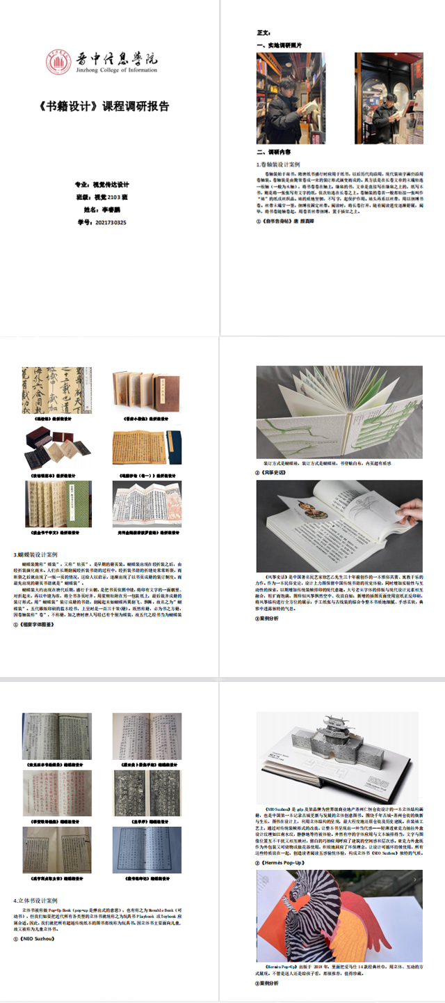 《书籍设计》是视觉传达设计专业的一门专业必修课程,该课程旨教授学生制作一本好书为课程目标,课程中讲授书籍设计的基本概念、技术和流程,帮助学生掌握将文字、图像、排版等元素有机地结合起来,打造出高质量、美观和功能性强的书籍,提升整体设计能力。为了更好地适应社会对人才的需求,课程团队对课堂内容、教学方法、实践环节、教学评价以及课后活动等方面进行全面改革。
