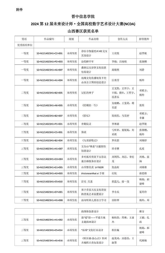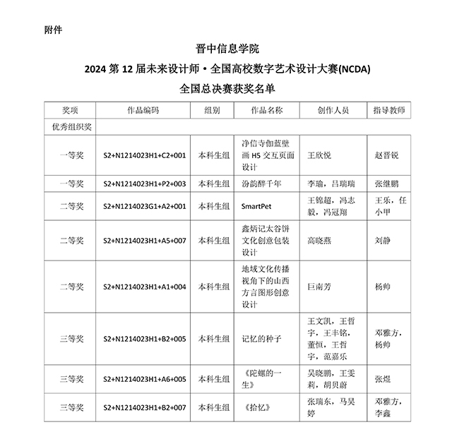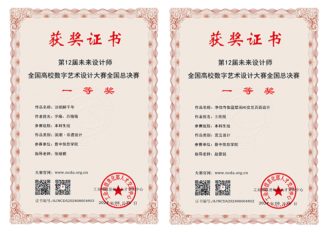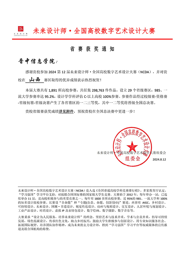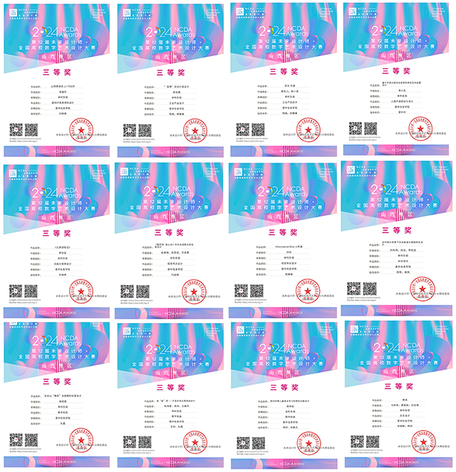 近日,2024第12届未来设计师·全国高校数字艺术设计大赛(NCDA)全国总决赛获奖名单已揭晓。我校艺术传媒学院学生参赛作品斩获全国等级奖项8项,其中一等奖2项、二等奖3项、三等奖3项,另获省级奖20项,成绩斐然。