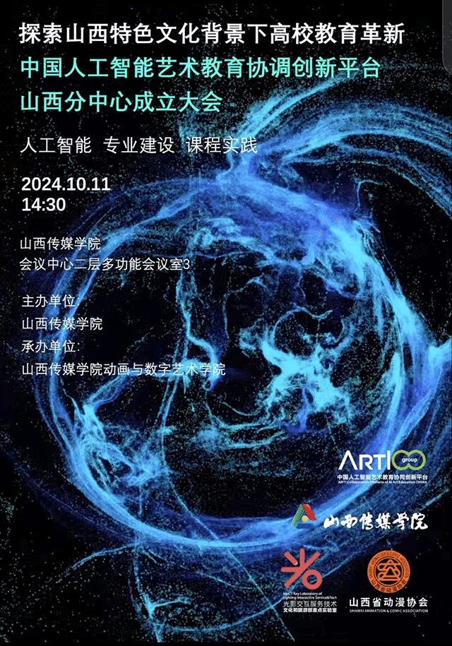 10月11日,中国人工智能艺术教育协同创新平台山西分中心成立大会在山西传媒学院会议中心隆重举行。本次大会以“探索山西特色文化背景下高校教育革新:人工智能+专业建设/课程实践”为主题,旨在推动人工智能技术与山西特色文化的深度融合,促进高校教育在人工智能领域的创新发展。艺术传媒学院数字媒体教研室主任杨帅、视觉传达设计教研室主任孔霞、动画教研室主任贺跃龙、环境设计教研室主任范钱江等教师参与此次交流会。