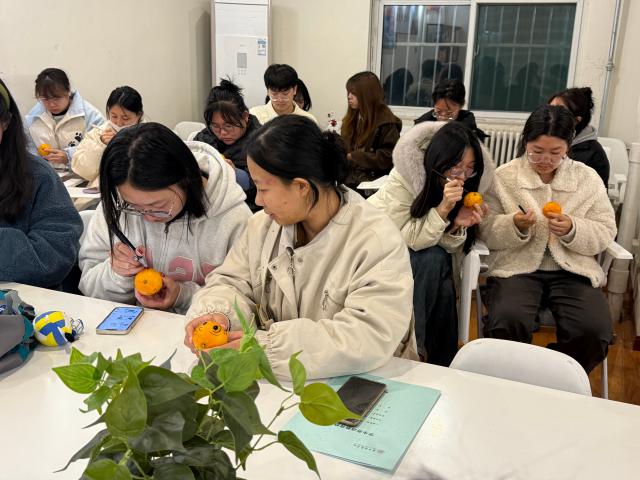 没有绘画技巧的高低之分,只有尽情释放内心想法的自由空间。拿起画笔,在橘子的表皮轻轻落下第一笔,同学们将自己的喜怒哀乐通过线条呈现在这个小小的橘子上,每一笔都是情感的倾诉。结束后同学们分享自己最近的情绪,互相聊天倾诉,彼此排忧解愁,王老师也给同学们答疑解惑,现场氛围高涨。当同学们专注于给橘子画画时,烦恼仿佛渐渐远去,全身心沉浸在当下的宁静与专注之中。而在完成作品后,与身边的伙伴分享自己所画橘子背后的故事,又能拉近彼此的距离,让我们感受到理解与被理解的温暖。