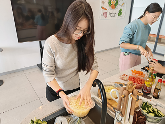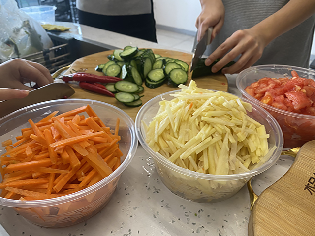 在食材准备区,切菜声奏响了美食的“前奏”,异科导师和同学们齐心协力,就此开启备餐之旅。在任珊雨老师的指导下,同学们热情高涨,有条不紊地处理着各类食材。瞧,有的同学负责清洗蔬菜,把西红柿、油麦菜等置于水流下反复冲洗,确保每一片菜叶、每一颗果实都干净清爽;还有的同学则迫不及待地拿起菜刀,跃跃欲试地准备切配食材呢。忙碌备菜中,现场一片欢声笑语,气氛格外融洽,大家都沉浸在这别样的备餐欢乐中。