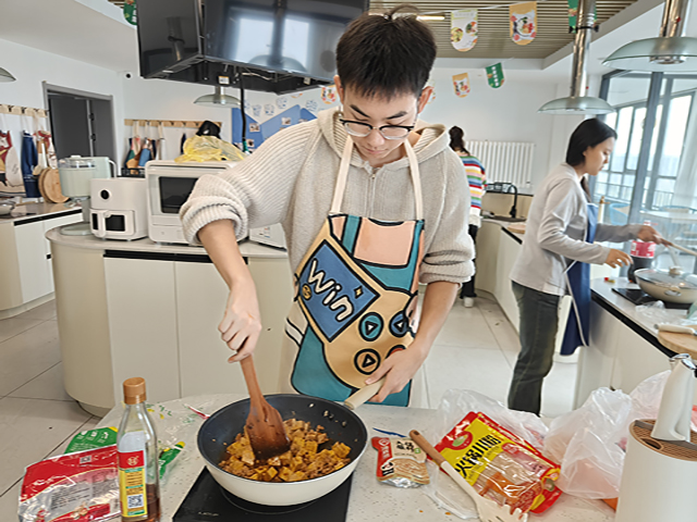 炒菜环节可谓是整个烹饪过程中的“高光时刻”,宛如一场令人瞩目的“厨艺大比拼”,精彩纷呈。同学们有序地进行点火、倒油的操作,眼睛一眨不眨地盯着油锅,心里既紧张又期待。当油开始微微冒烟时,放入花椒、辣椒等调料,“噼里啪啦”一声,香味瞬间弥漫开来。紧接着,将切好的豆腐块轻轻放入锅中,小心翼翼地翻炒,让每一块豆腐都均匀地裹上热油与调料,再缓缓倒入精心调制好的酱汁,小火慢炖一会儿,待豆腐充分吸收了酱汁的醇厚味道,撒上一把葱花,一份红亮诱人、麻辣鲜香的麻婆豆腐便大功告成了。接着,同学们将准备好的蔬菜、肉类等食材依次下锅,挥动着铲子开始翻炒。其他同学也都在各自的炉灶前忙碌着,现场欢声笑语不断,师生间的情谊随着这烟火气愈发深厚。