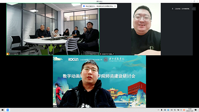 11月22日,动画专业与北京若森数字科技股份有限公司开展数字动画制作产业学院师资建设研讨会。若森数字学术总监姬巍,学术经理孙乐童,与艺术传媒学院领导,动画教研室教师、数字媒体教研室教师代表共聚线上,以未来产业学院师资建设为话题,为即将开展的教师赴企业挂职展开研讨。